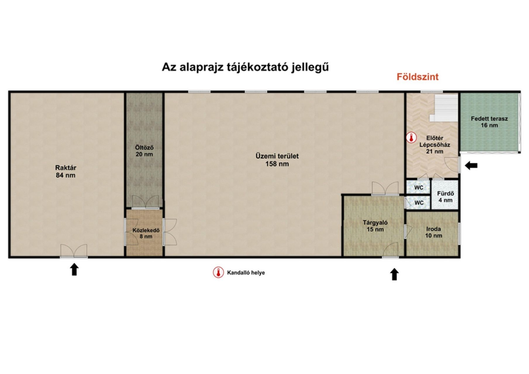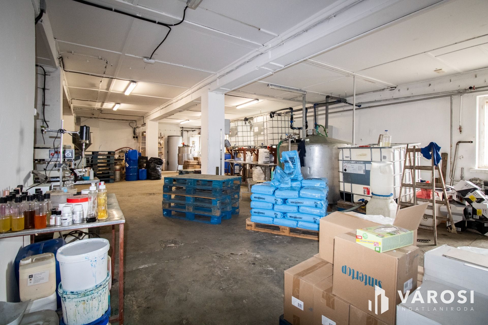 A földszinten található, összesen 295 négyzetméteres üzemépület jelenleg csomagolóüzemként funkcionál, amely azonnal alkalmas működtetésre. Az üzemi tér 158 négyzetméteres, ehhez kapcsolódik egy 84 négyzetméteres raktár, valamint plusz öltöző, iroda, tárgyaló-előtér és mellékhelyiség. Az ingatlan zárható garázzsal és elkülönített udvarrésszel is rendelkezik, amely biztosítja a zavartalan munkavégzést.