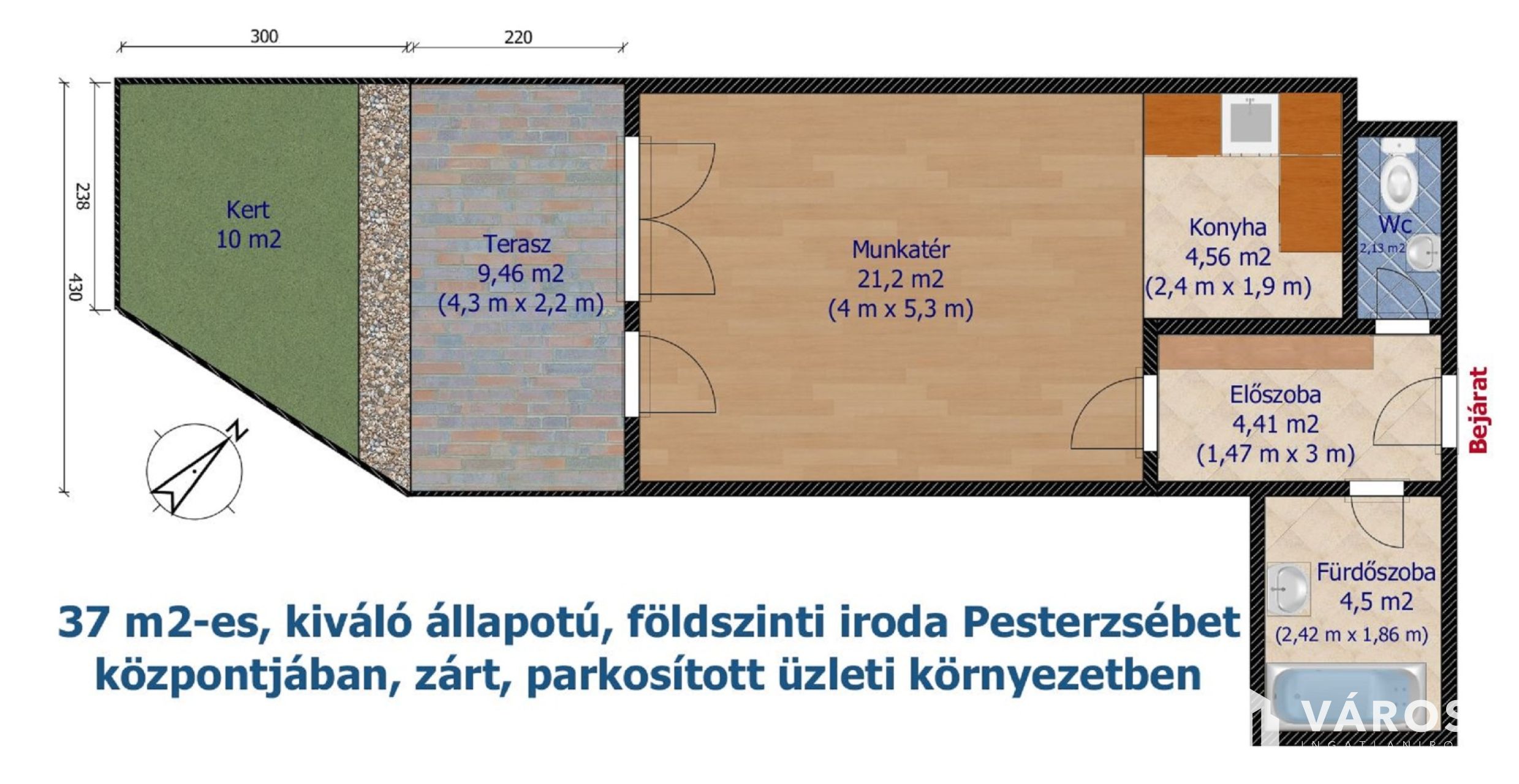 Különlegessége a munkatérből közvetlenül nyíló 9,5 m2-es, kövezett és fedett terasz, valamint az előtte lévő 10 m2-es, műfüves, saját kiskert, mely kivételesen ritka lehetőség.