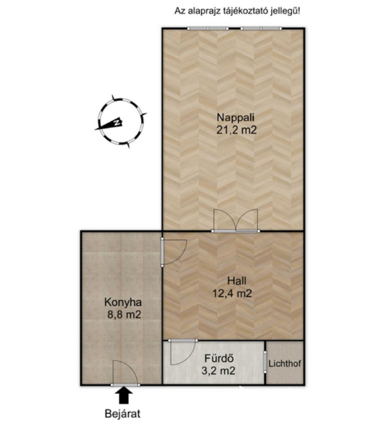 Az ingatlan nettó alapterülete 44 m2 (szoba, hal, fürdő, konyha)