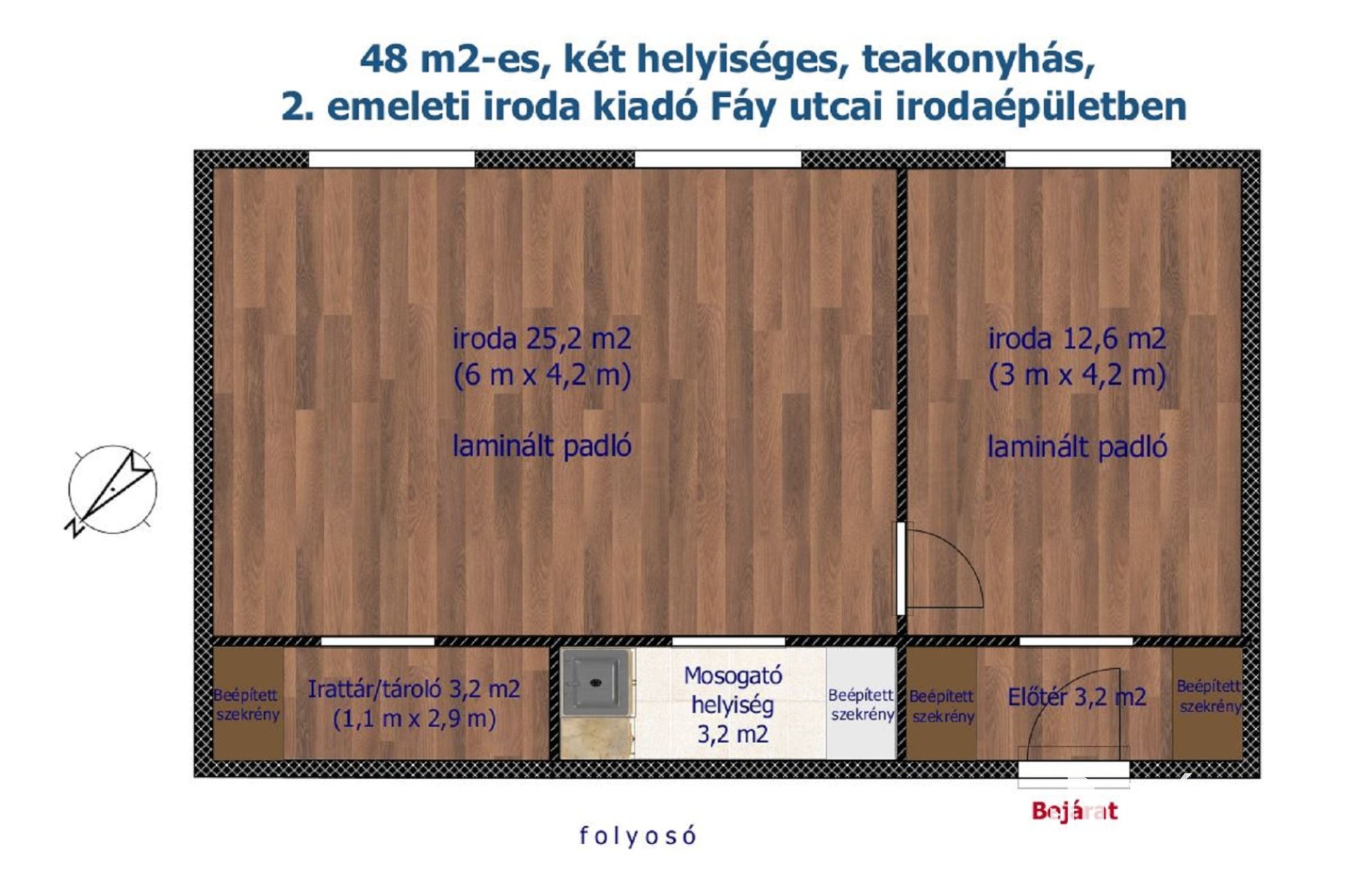 48 m2-es, két helyiséges, teakonyhás, 2.emeleti iroda