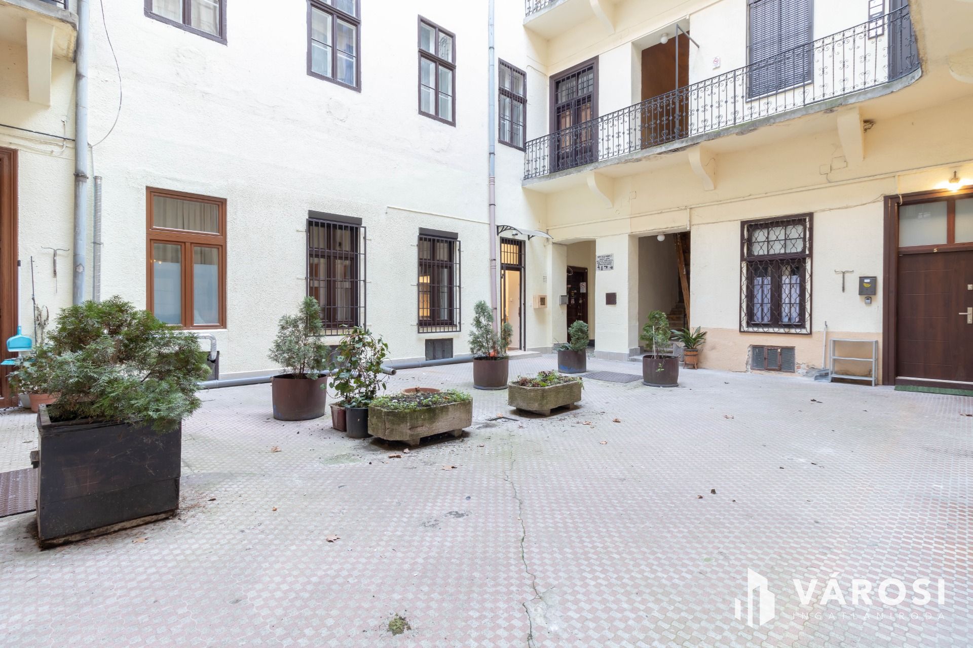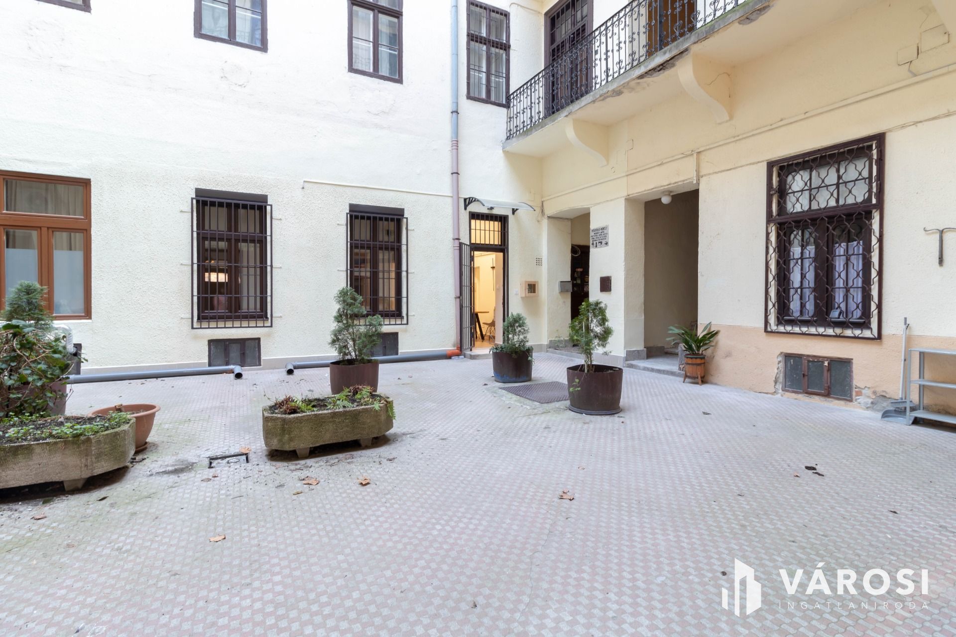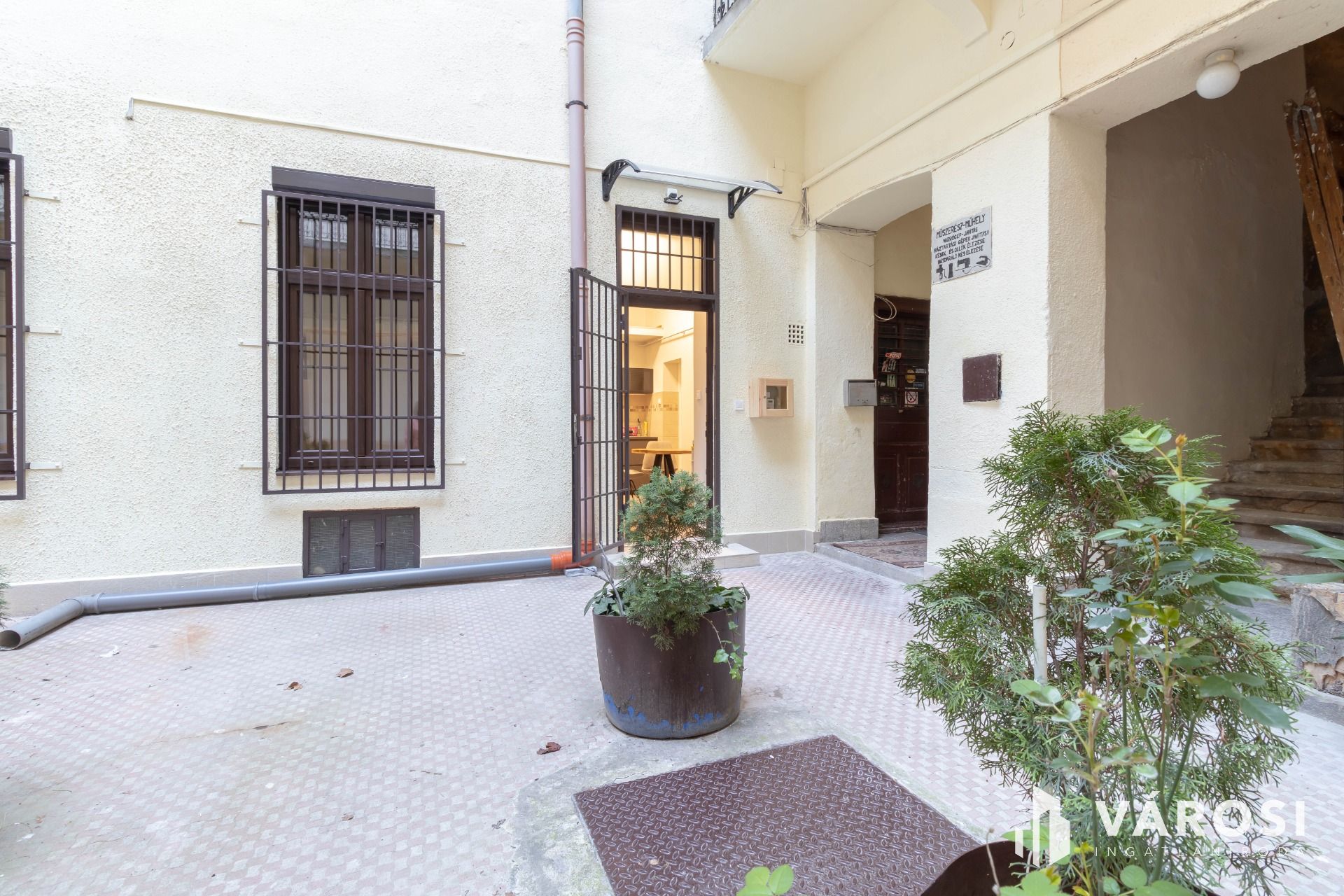A kiadó ingatlan egy öt szintes, 1936-ban épült, kiválóan karbantartott, tégla építésű ház földszintjén helyezkedik el, a belső udvarból közelíthető meg.