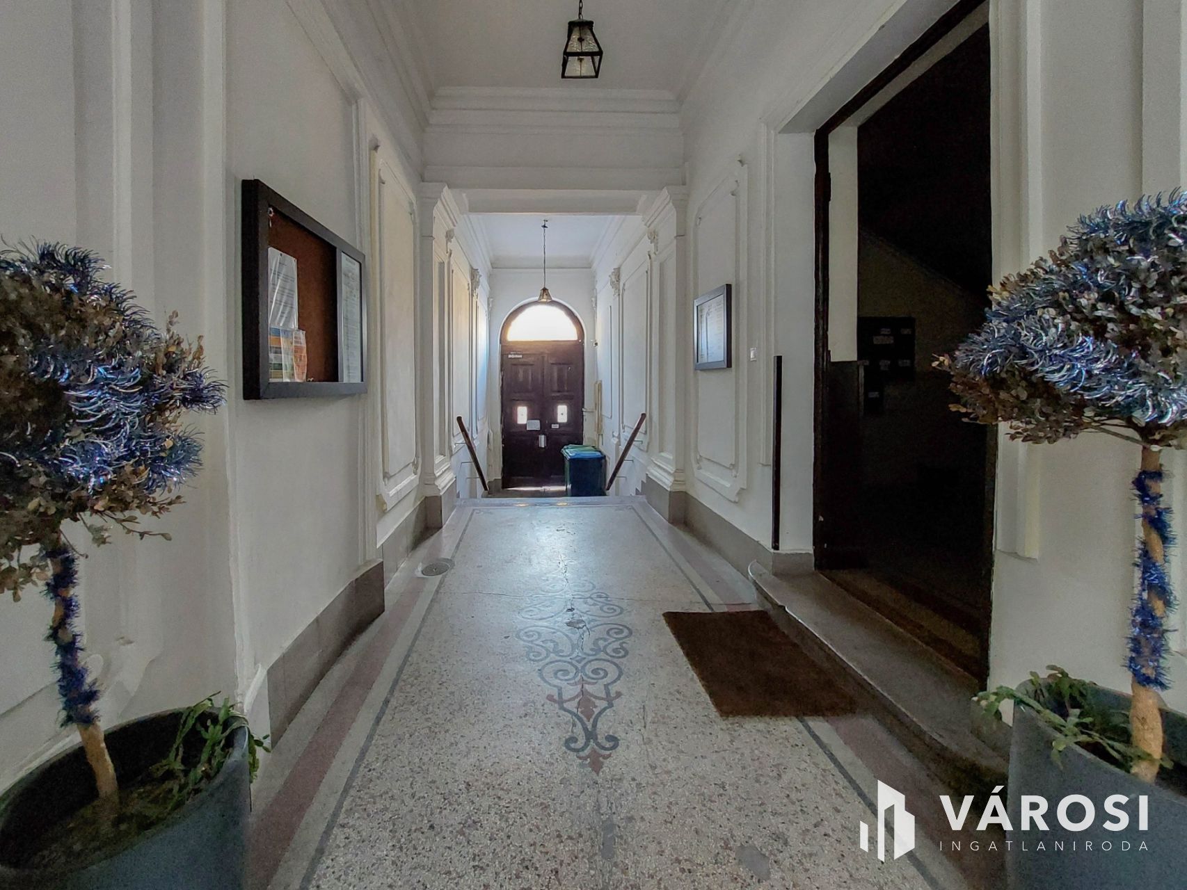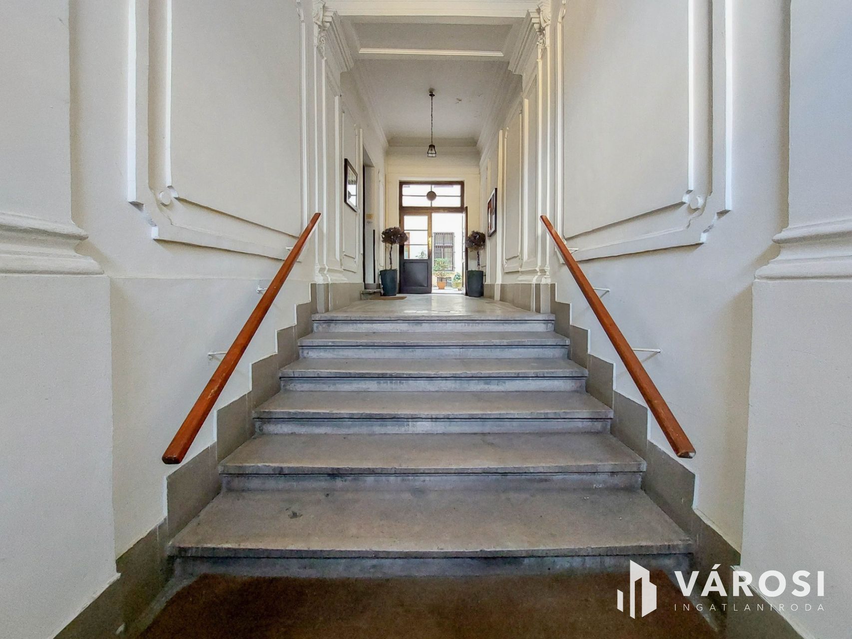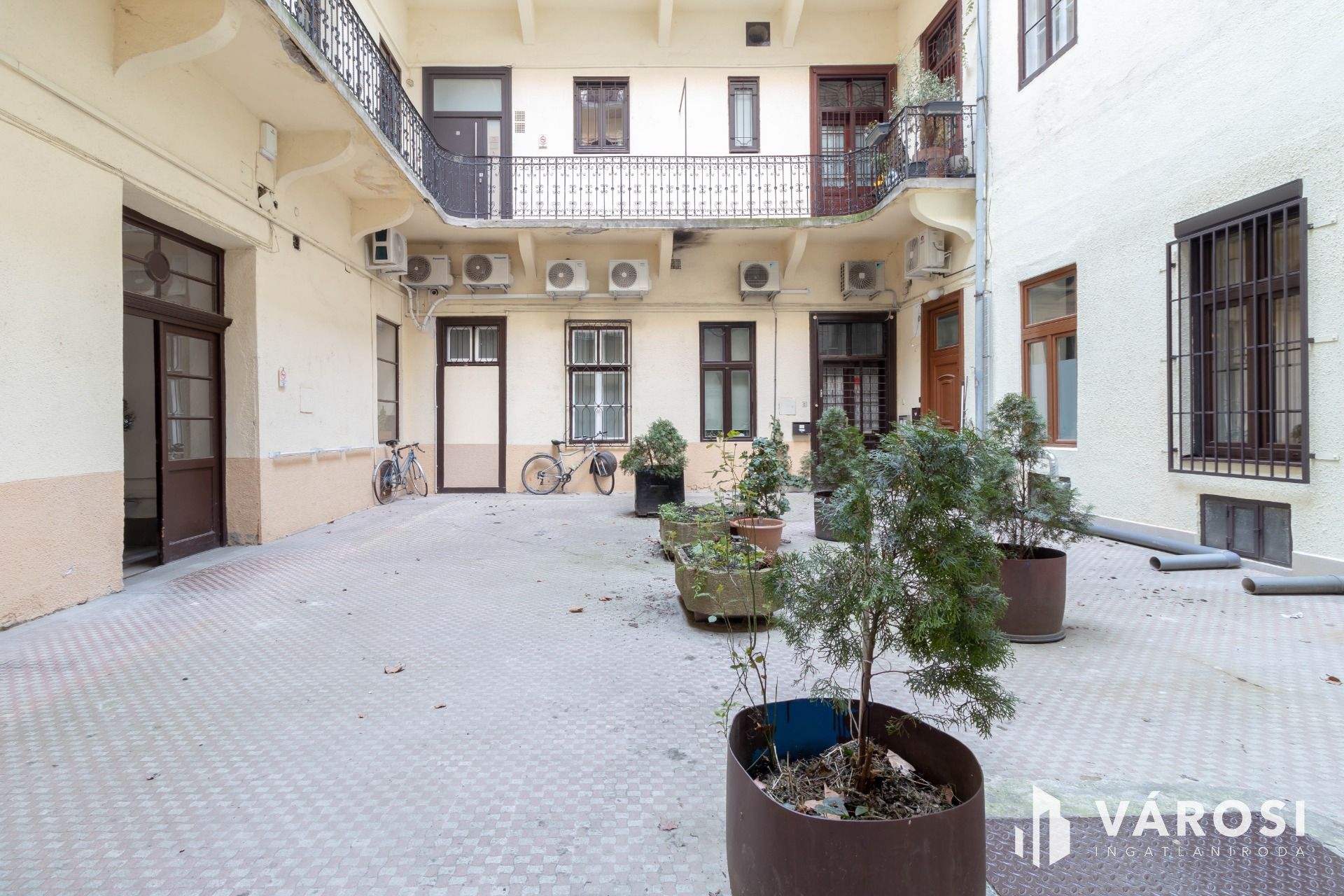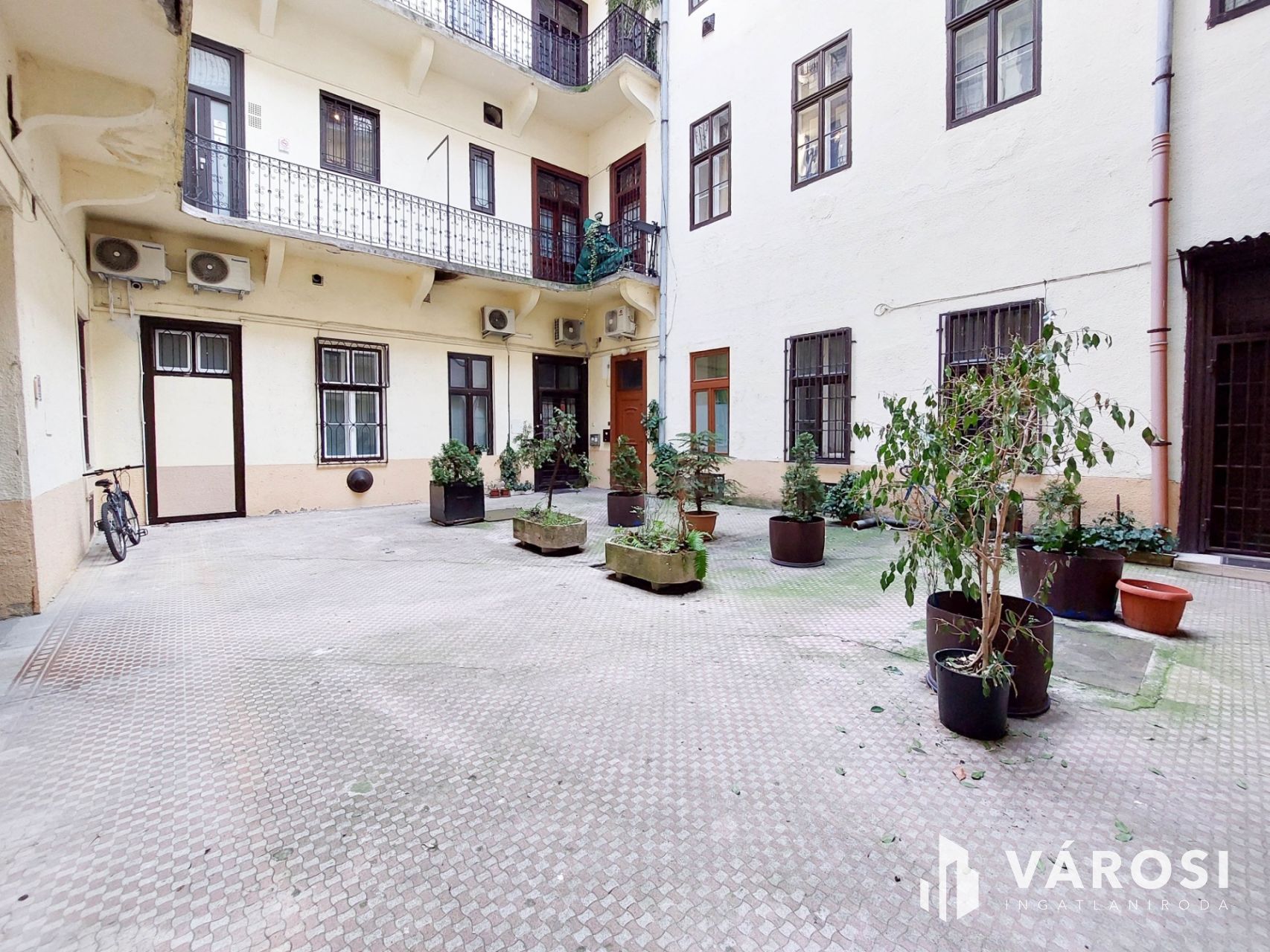 A kiadó ingatlan egy öt szintes, 1936-ban épült, kiválóan karbantartott, tégla építésű ház földszintjén helyezkedik el, a belső udvarból közelíthető meg.