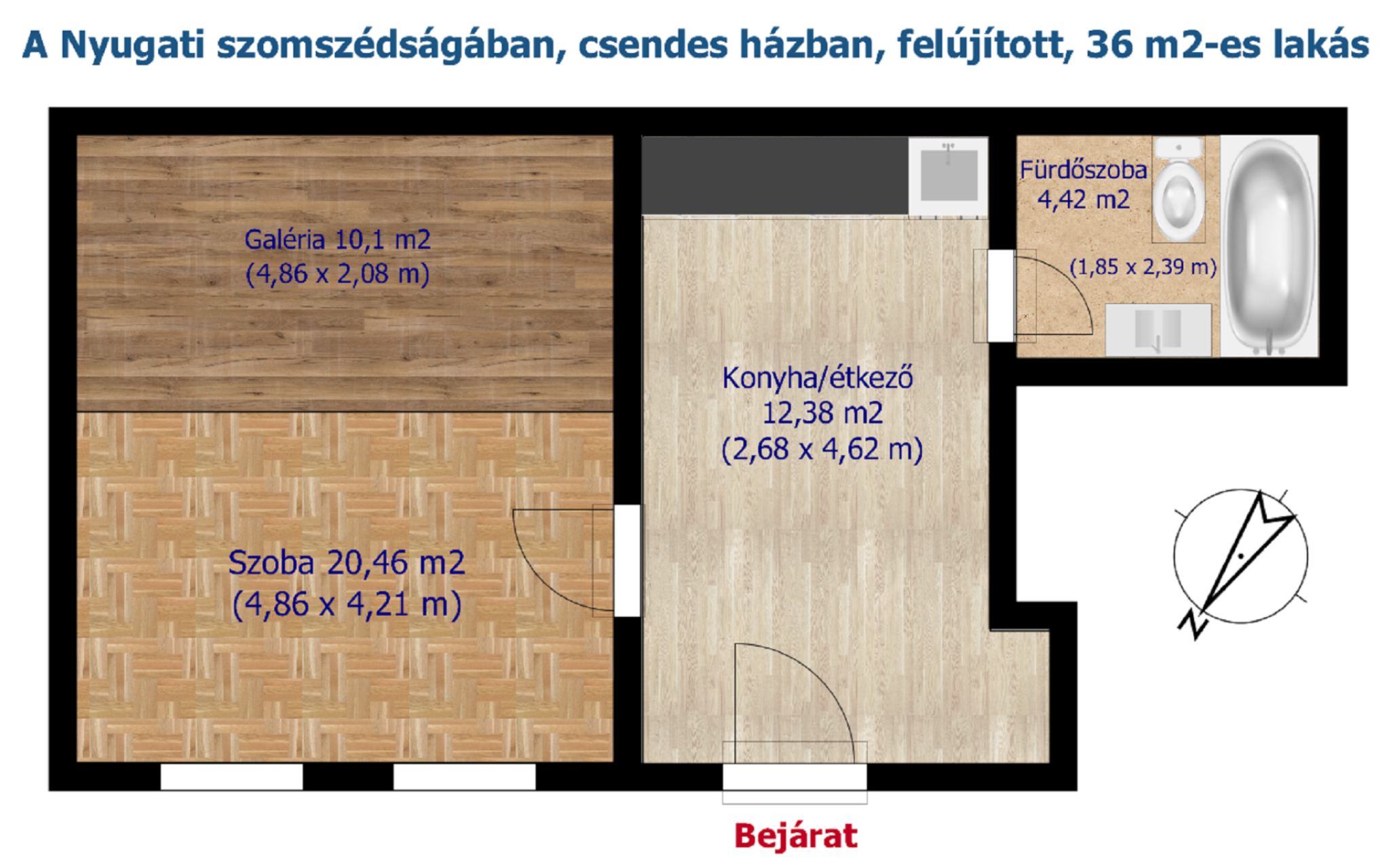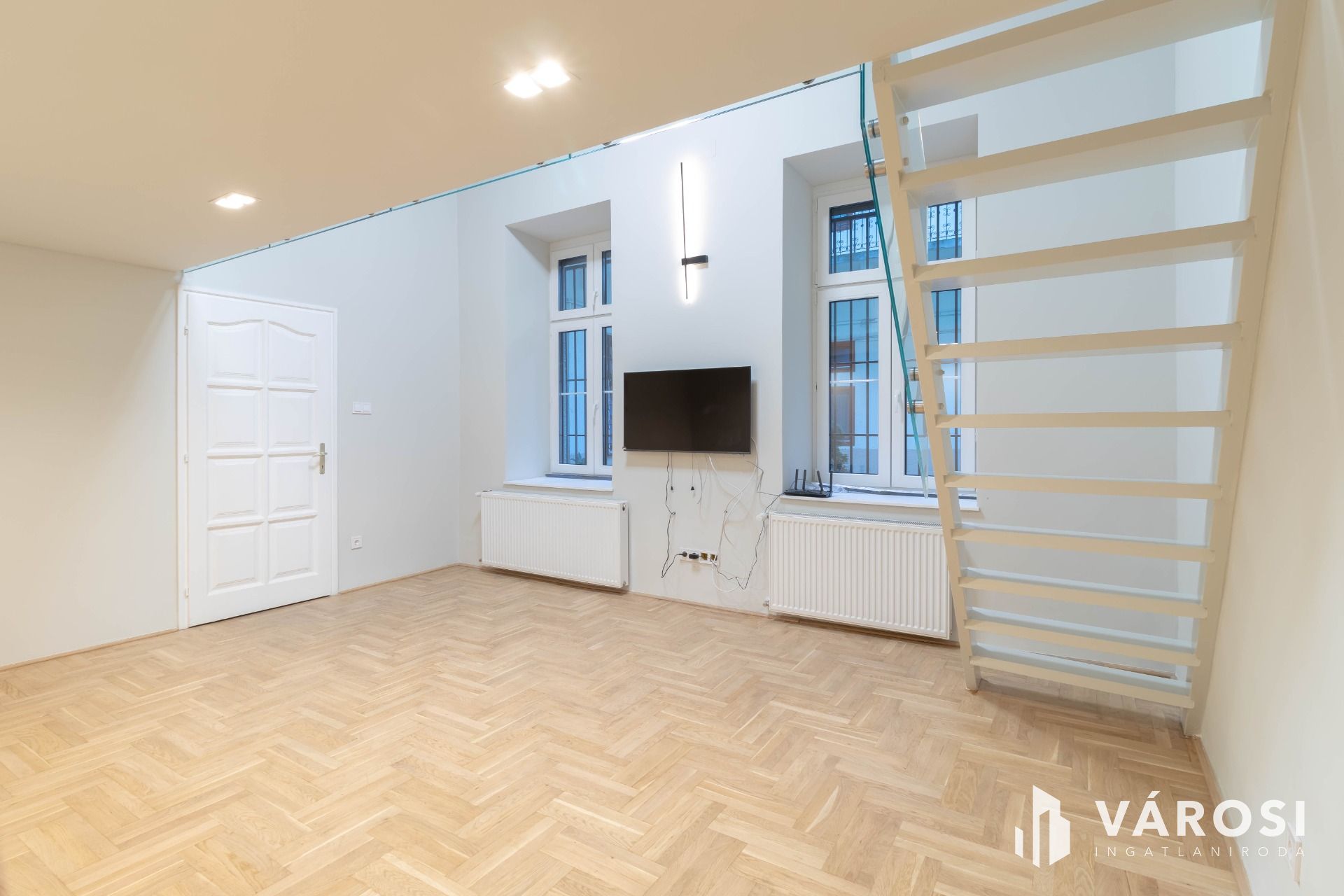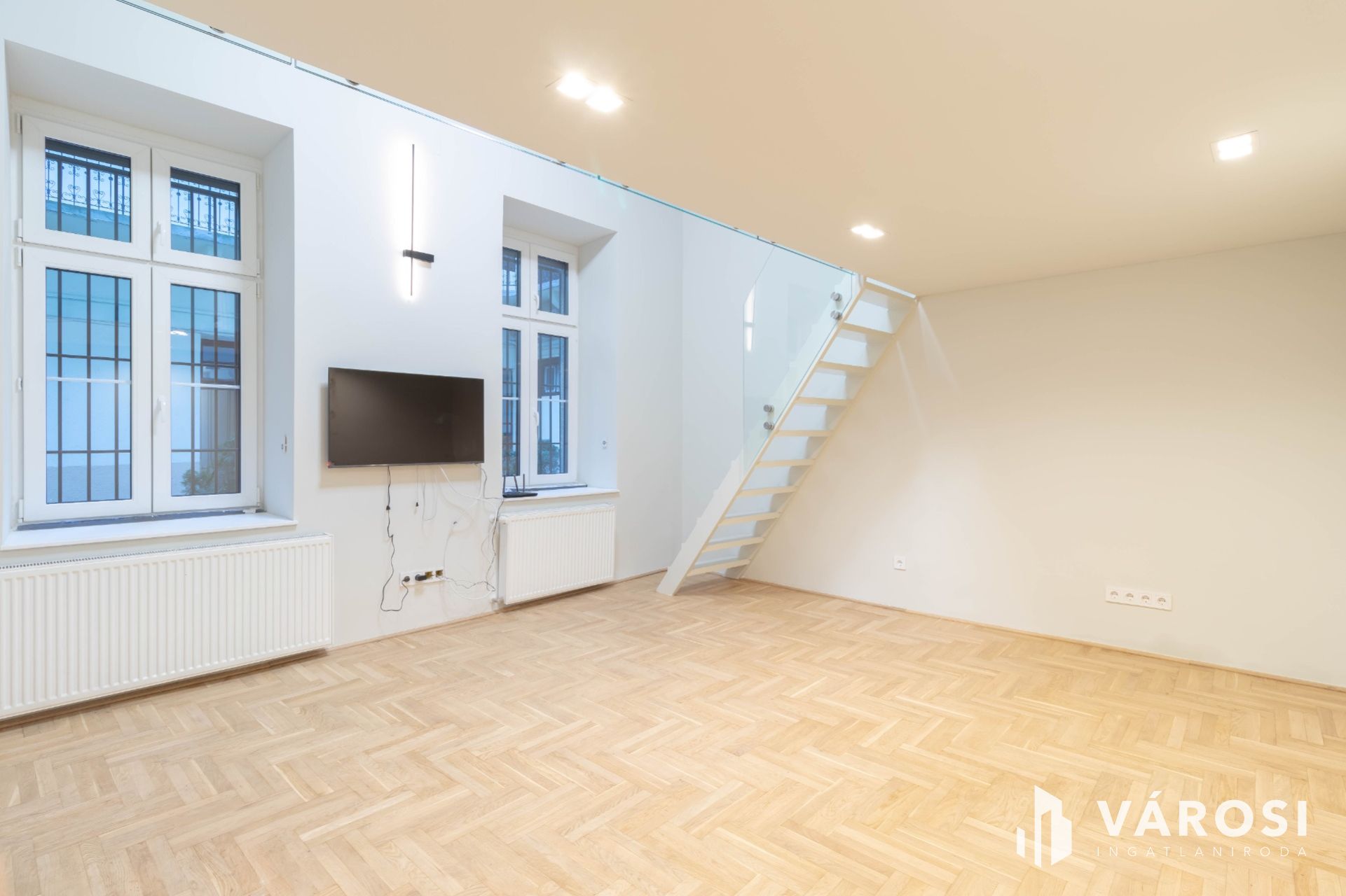 Az ingatlan alapterülete 36 m2, azonban a 20 m2-es szoba a nagy belmagasságnak köszönhetően kapott még egy 10 m2-es, elegáns megjelenésű álló galériát is, mely növeli a használható teret és lehetőséget ad egy, a nappalitól elkülönített hálószoba kialakítására.