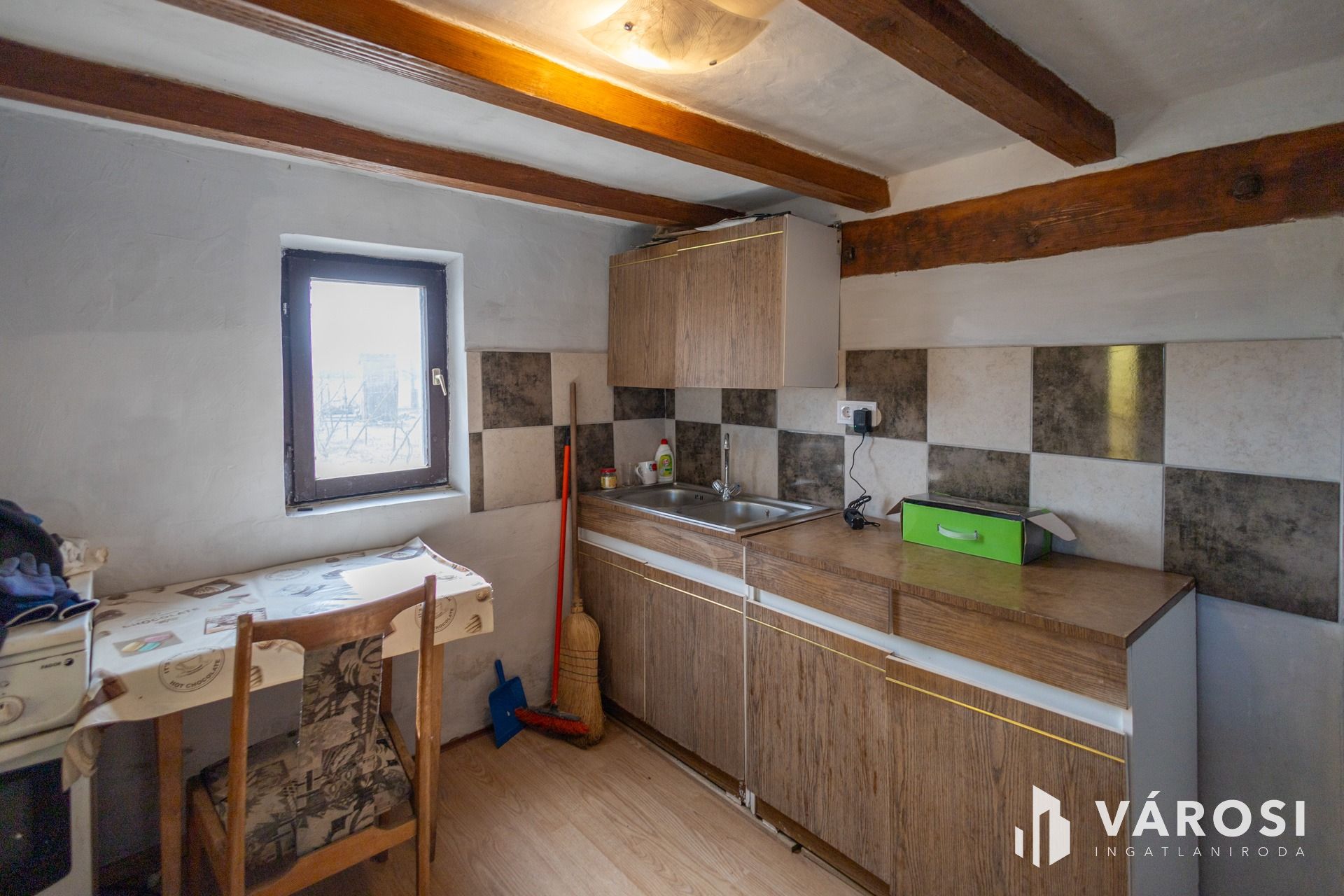 -Lakóépület (33,27 m²): szoba, konyha, fürdőszoba, fatüzelésű kályhás fűtéssel