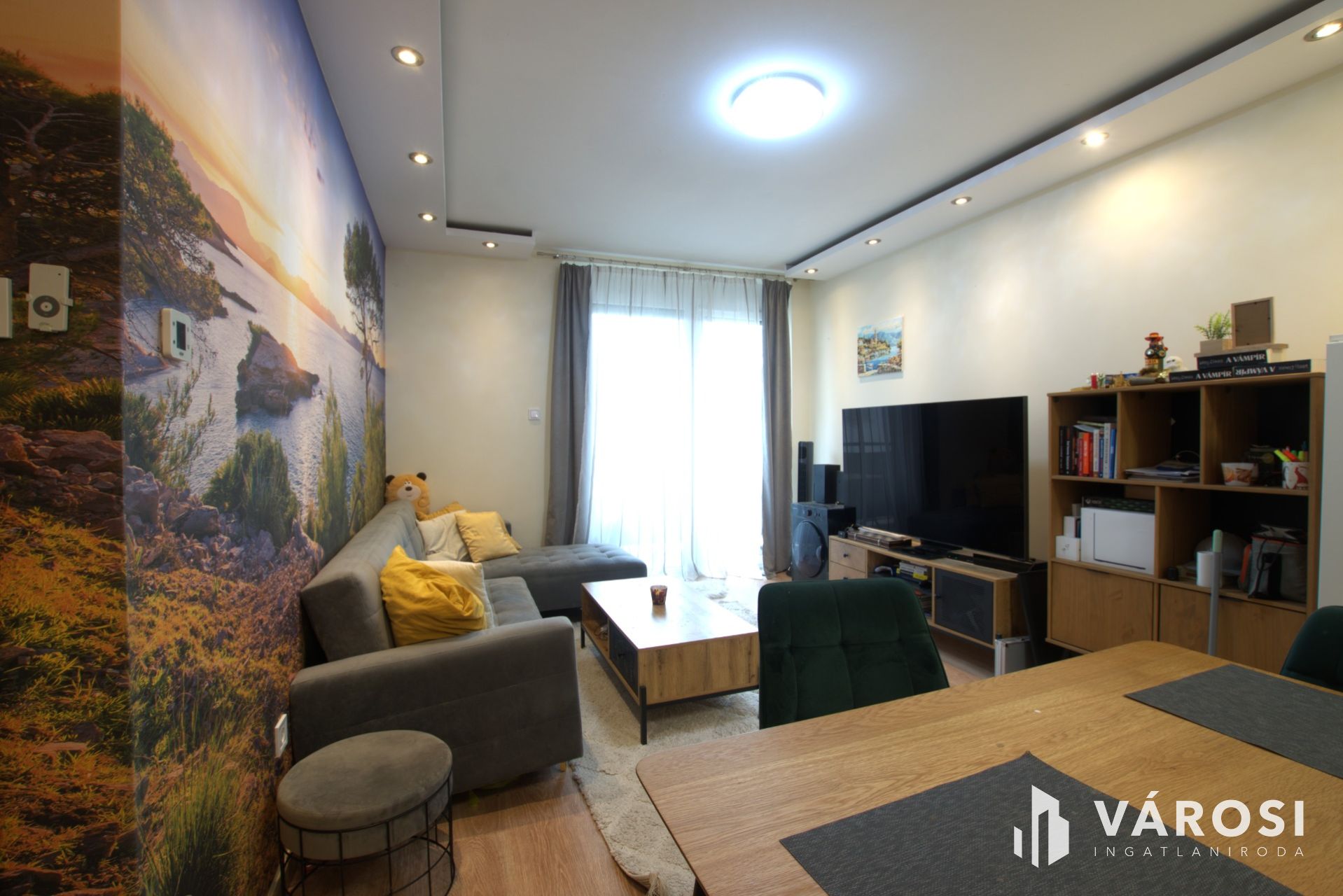A lakberendező által tervezett belső tér egyszerre letisztult és praktikus: amerikai konyhás nappali + háló, külön fürdő és külön WC, valamint beépített gardrób. A konyha teljesen gépesített, és a vételárban benne van több extra is (AEG mosógép, Klarstein szárítógép, elektromos redőnyök, szúnyogháló, hangulatvilágítás).