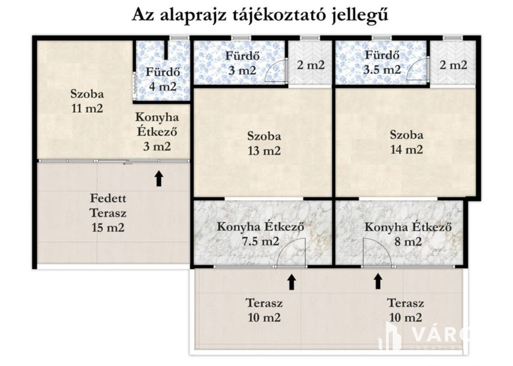 A három apartman kialakítása tudatosan „piacra van hangolva”. Az 1-es és 2-es apartman közvetlen szomszédok, és egy közös teraszról közelíthetők meg, a 3-as apartman viszont teljesen szeparált egység, saját, zárt terasszal, ezért különösen kedvelt a babával érkezők és a párok körében. A 3-as apartman körülbelül 18 m², és ehhez kapcsolódik egy 15 m²-es zárt terasz; saját teakonyhával, zuhanyzós fürdőszobával és egy hálóval rendelkezik, a tolóajtós, teljes üvegfelület pedig a szoba teljes szélességében nyit kilátást az udvarra, amitől az egész egység kifejezetten világos és élhető. A 2-es apartman egy kétszemélyes ágy mellett két gyermek elszállásolására is alkalmas fekvőfelülettel lett kialakítva, összesen 26 m²-es, saját teakonyhával, szobával és zuhanyzós fürdővel, valamint 10 m²-es terasszal. Az 1-es apartman szintén 27,5 m², és két felnőtt + egy gyermek fogadására ideális, ugyancsak saját teakonyhával, zuhanyzós fürdővel és 10 m²-es terasszal.