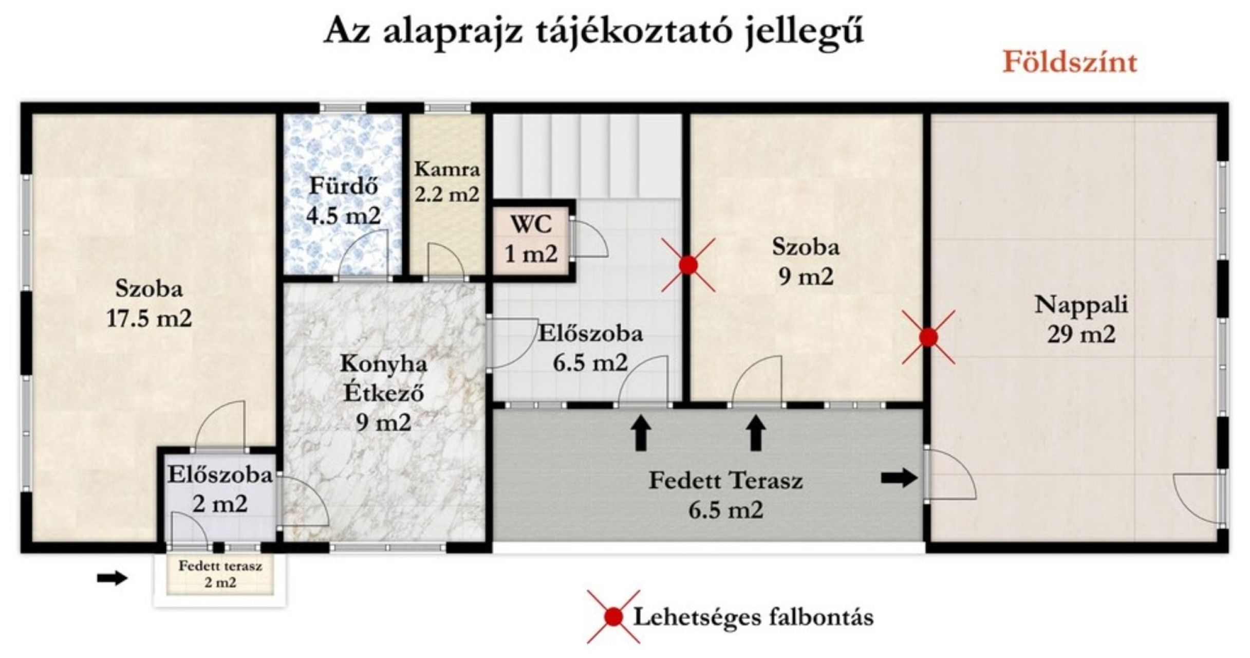 A belső elrendezés kompakt, sok funkciót kínál kis alapterületen. A földszinten előszoba, konyha–étkező, kamra, fürdőszoba, külön mellékhelyiség, egy nagy utcafronti szoba és a lépcsőfeljáró kapott helyet. Külön érdekesség, hogy a földszinten egy nagyobb és egy kisebb szoba közvetlenül a terasz felől is megközelíthető, ami számos használati lehetőséget kínál – akár dolgozószoba, vendégszoba vagy külön bejáratú lakrész kialakítására is.