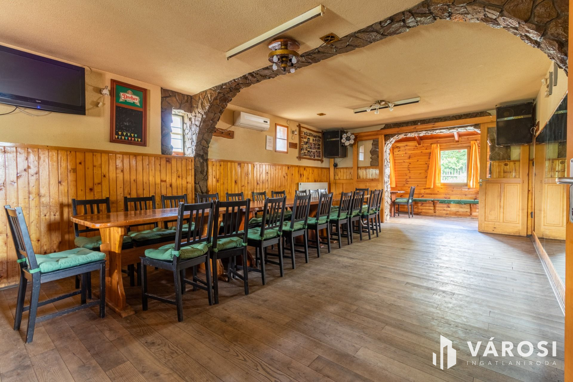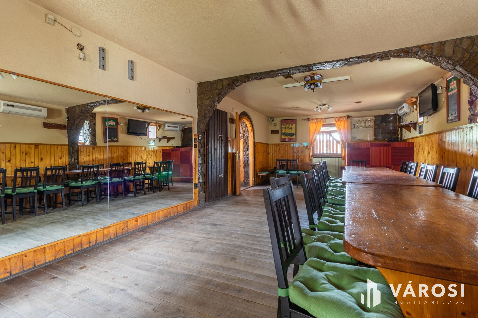 Az ingatlanon található egy két szintes, tégla építésű épület, amely eredetileg az 1960-as években épült, majd 2000-ben teljes felújításon esett át, és elnyerte jelenlegi formáját. Az alsó szinten egy 39 m2-es területen helyezkedik el egy iroda és öltözők. Itt találhatók fürdőszobák zuhanyzóval és mosdóval, biztosítva a megfelelő komfortot a vendégeknek és a sportolóknak. A felső szint 91 m2-es területen helyezkedik el, és egy kocsma került kialakításra. Ez a tér tökéletes helyszín lehet a pihenésre és a társaság élvezetére az edzések vagy sportesemények után.