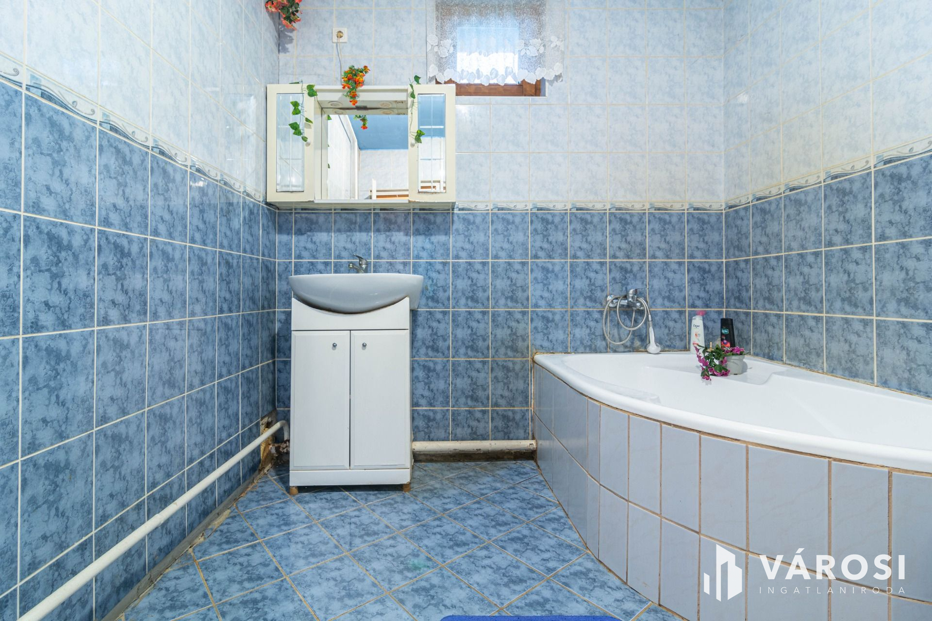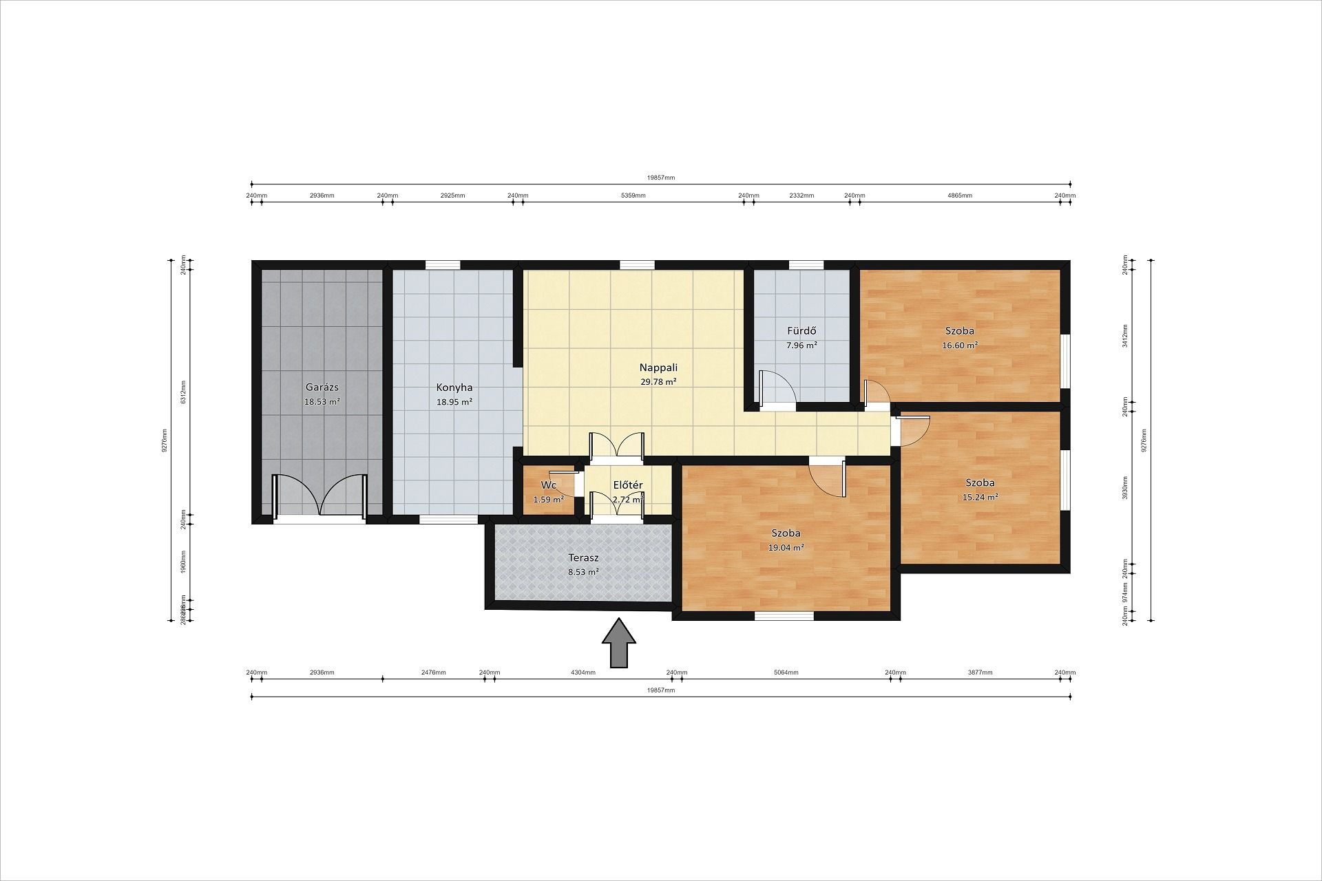 A teraszon keresztül jutunk be az előtérbe. Itt bal oldalon található egy Wc, tovább haladva pedig a nappaliba jutunk. A nappaliból nyílik a konyha és az étkező rész. Jobb oldalon a folyosón jutunk el a fürdőbe és a 3 szobába. A szobák laminált parkettával illetve padlószőnyeggel burkoltak, a többi helység burkolata csempe.