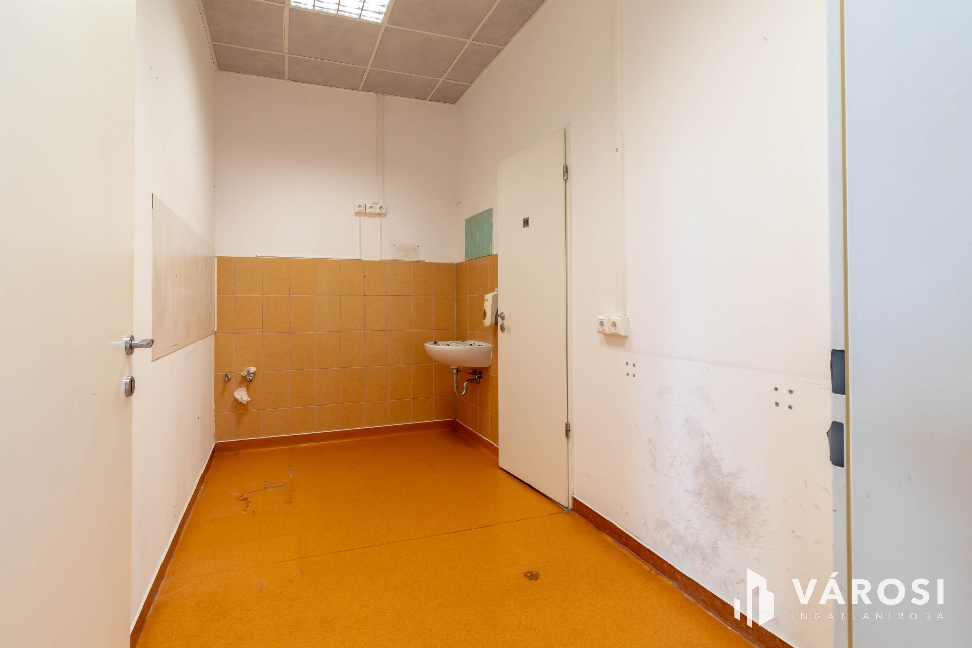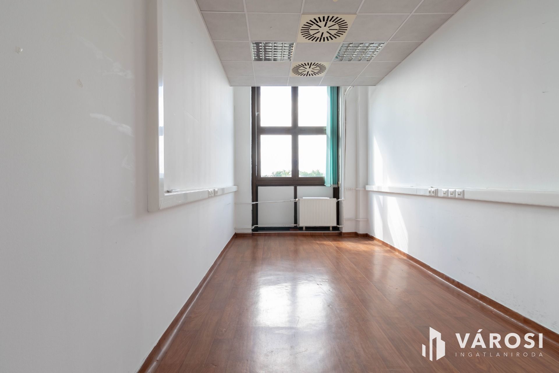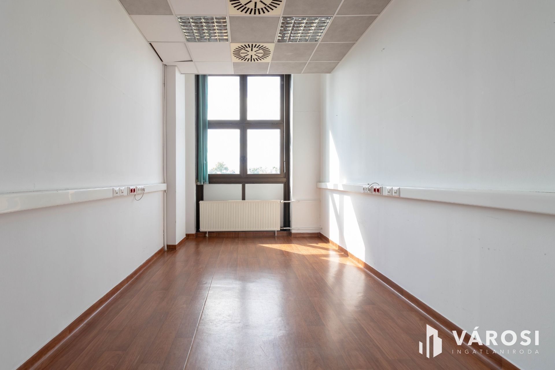 A 2. emeleten található, belső vizesblokkal rendelkező, 132 m2-es ingatlanrészben van egy 77 m2-es nagy terem, valamint két 17 m2-es iroda. A 8 m2-es előtérből nyílik mindegyik, valamint innen nyílik a 7 m2-es konyha is. A konyhából pedig az 5 m2-es mosdó, külön férfi és női wc-vel.