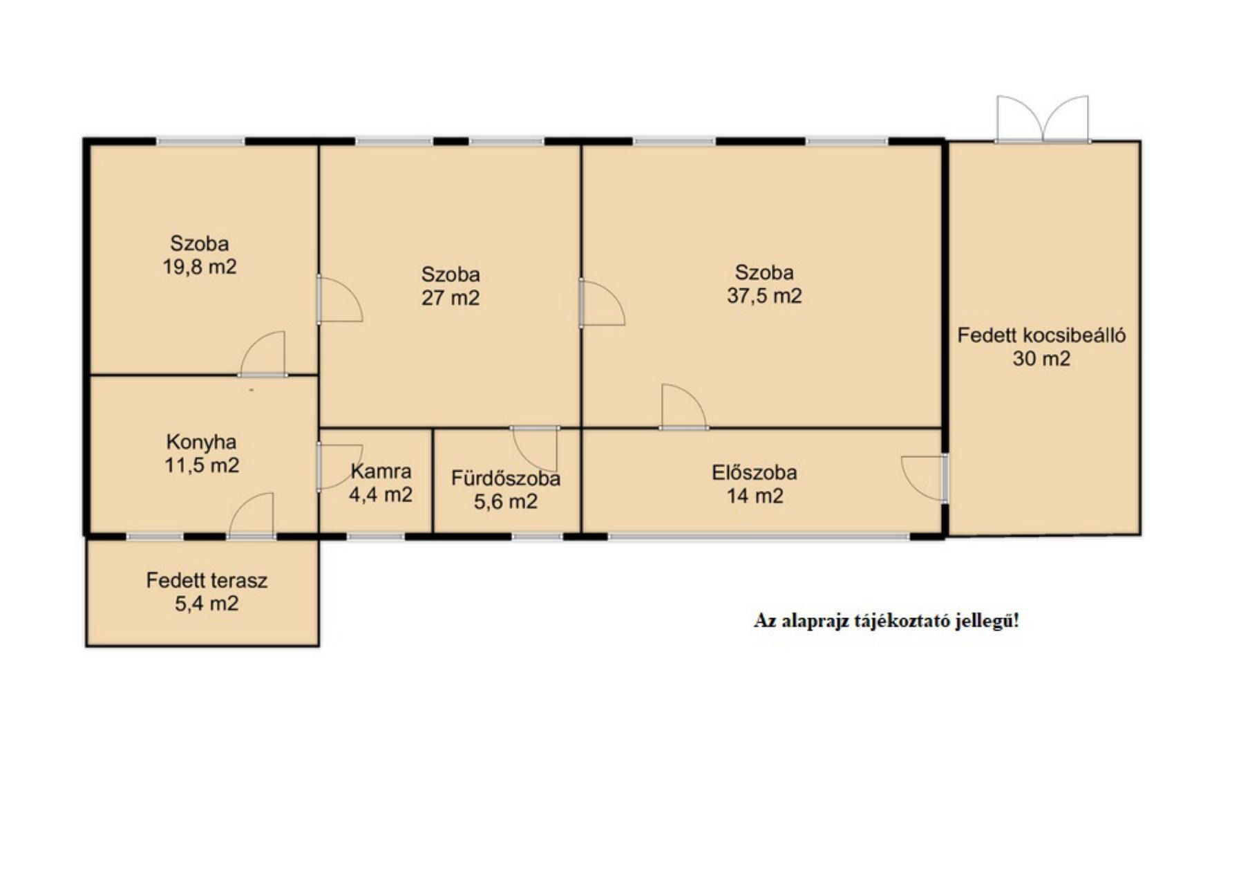 Az ingatlan elosztása: 3 szoba, fürdőszoba, konyha, melléképület, fedett kocsibeálló és egy terasz.