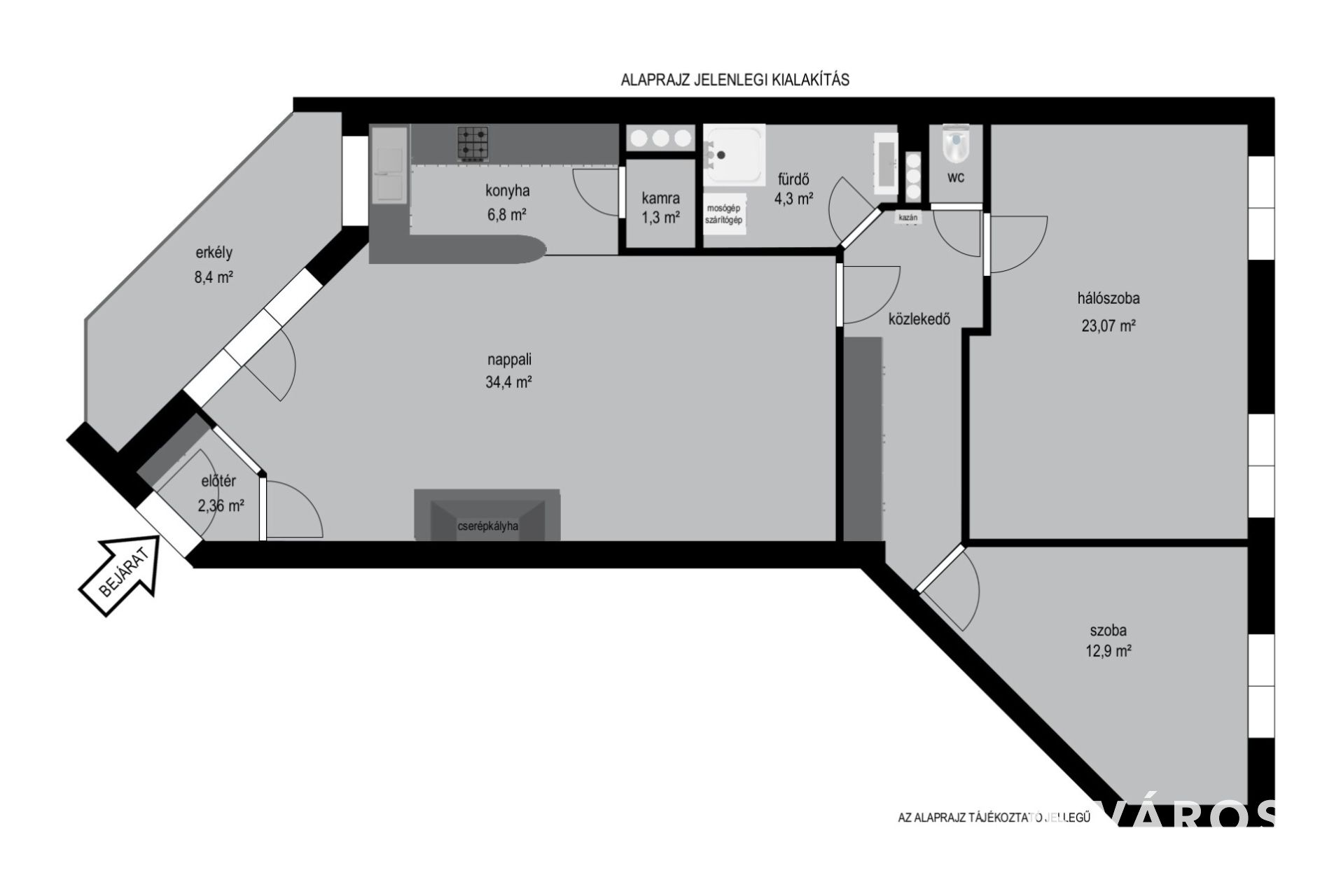 Az ingatlan egy liftes, 4 szintes társasház második emeletén helyezkedik el. A praktikus kialakítású otthon elosztása jelenleg: