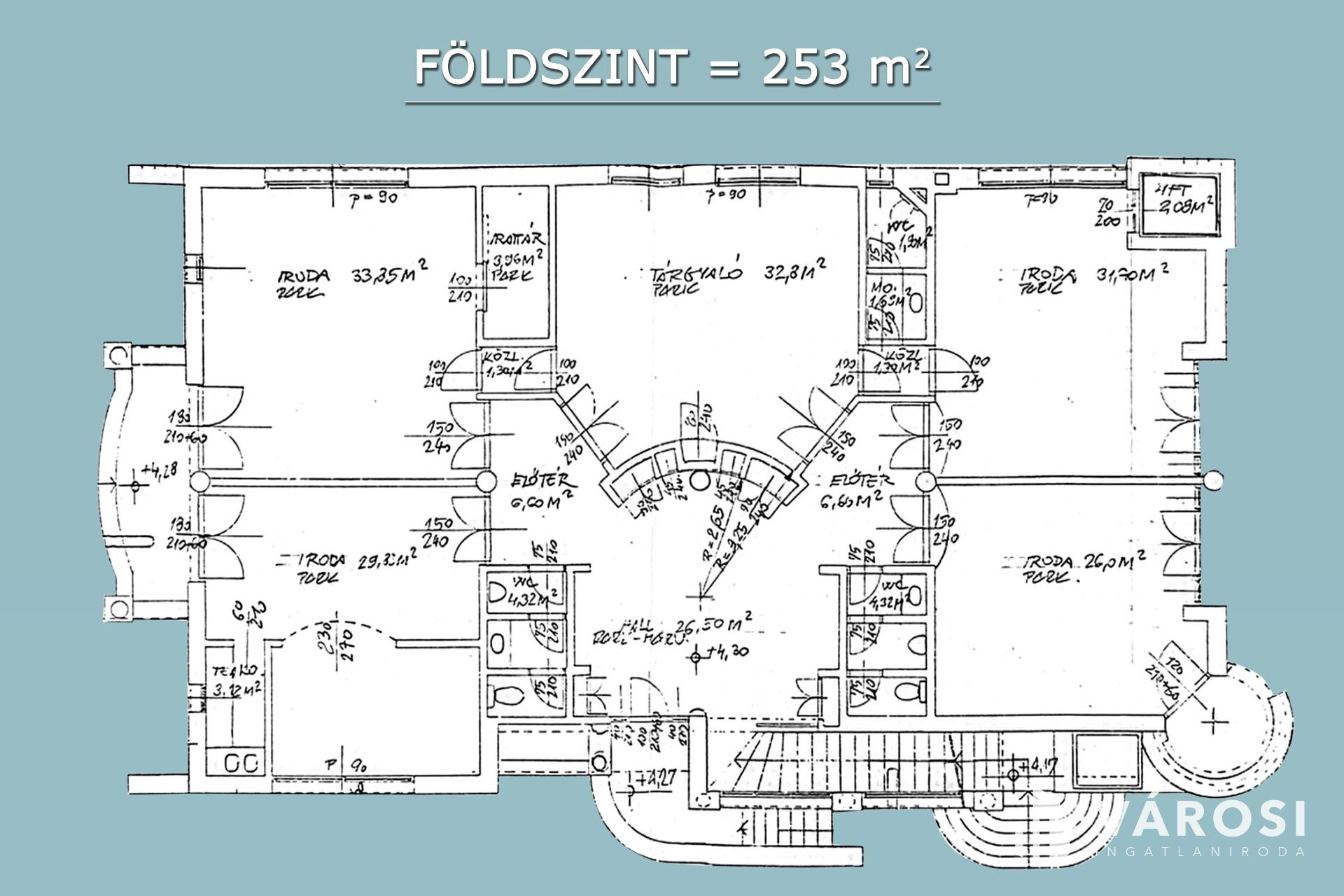 FÖLDSZINT - 253 m²: Hall, teakonyha, 3 mosdó, 4 iroda, tárgyaló, nagy terasz, erkély