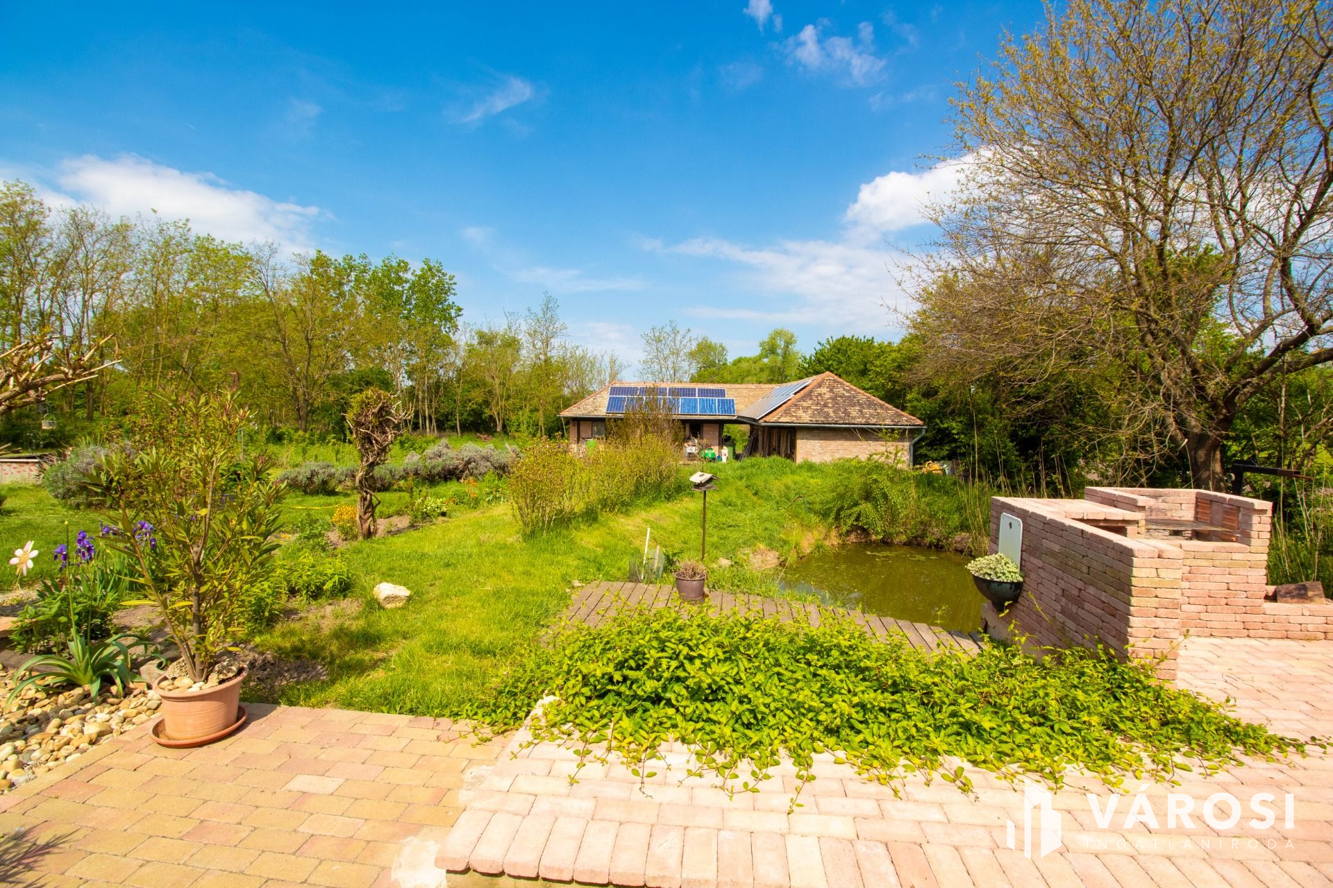A nagy kertben ( 3.377 m2) található még kerti tó, grillező, egy kis saját erdő, gyümölcsfák és szőlős is.