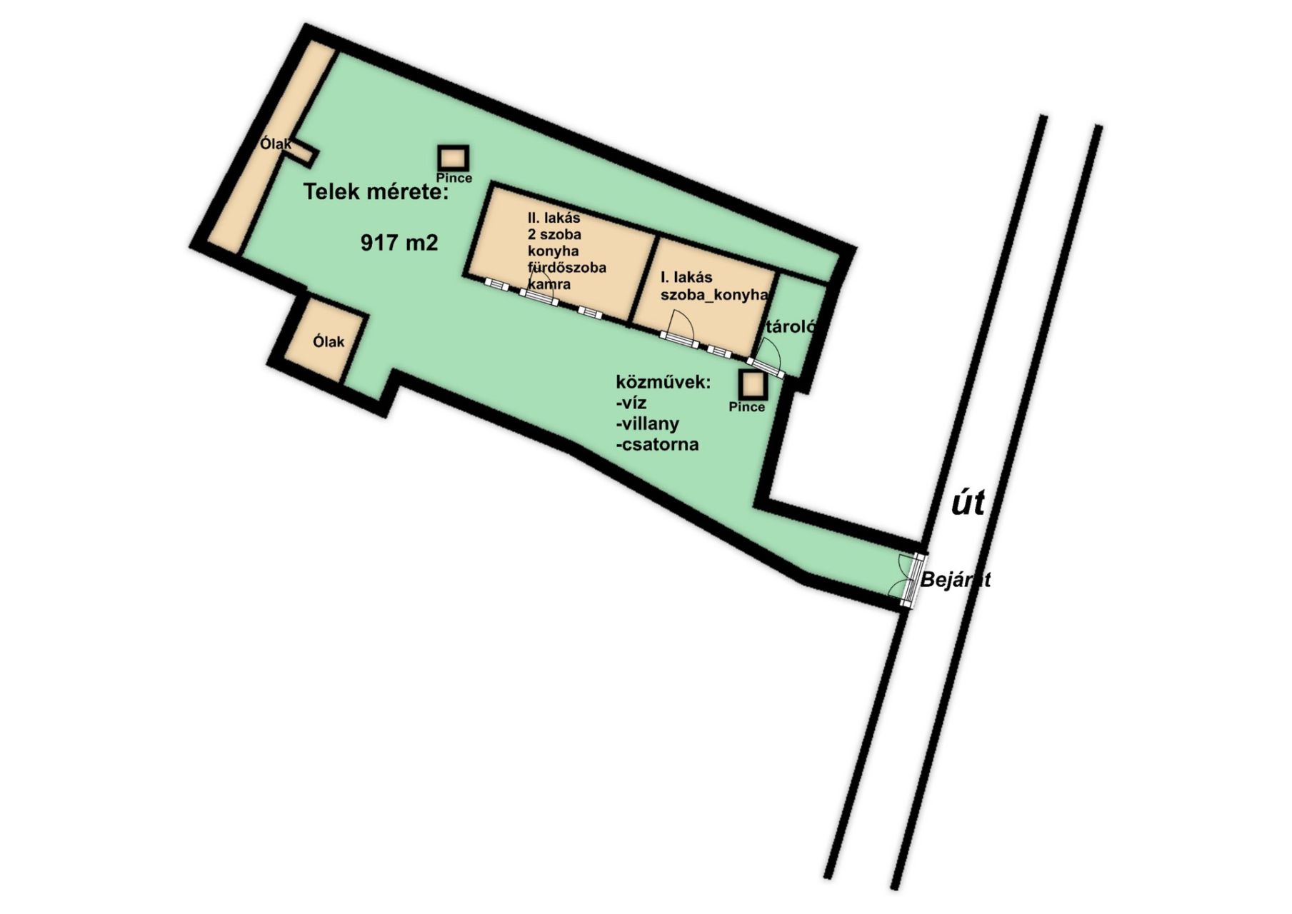 Az első lakásban 2 szoba, konyha, fürdőszoba és kamra van. A másodikban 1 szoba és konyha található. (romos állapotban)