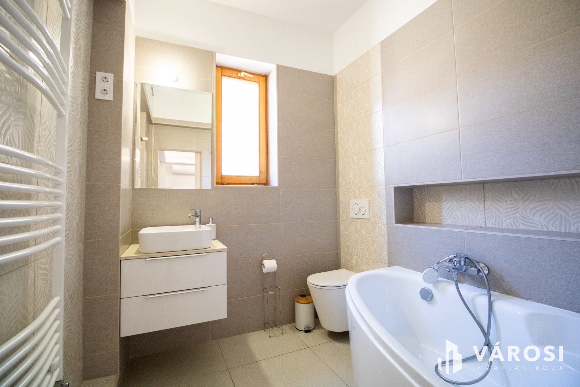 A konyha az ingatlan egyik kiemelkedő pontja, hiszen magasfényű fehér konyhabútor került beépítésre mennyezetig kialakított tárolókkal és teljes gépesítéssel. Az elektromos főzőlap, a sütő, a gránit mosogató, a beépített hűtőszekrény és a mosogatógép mind a konyha részét képezik.