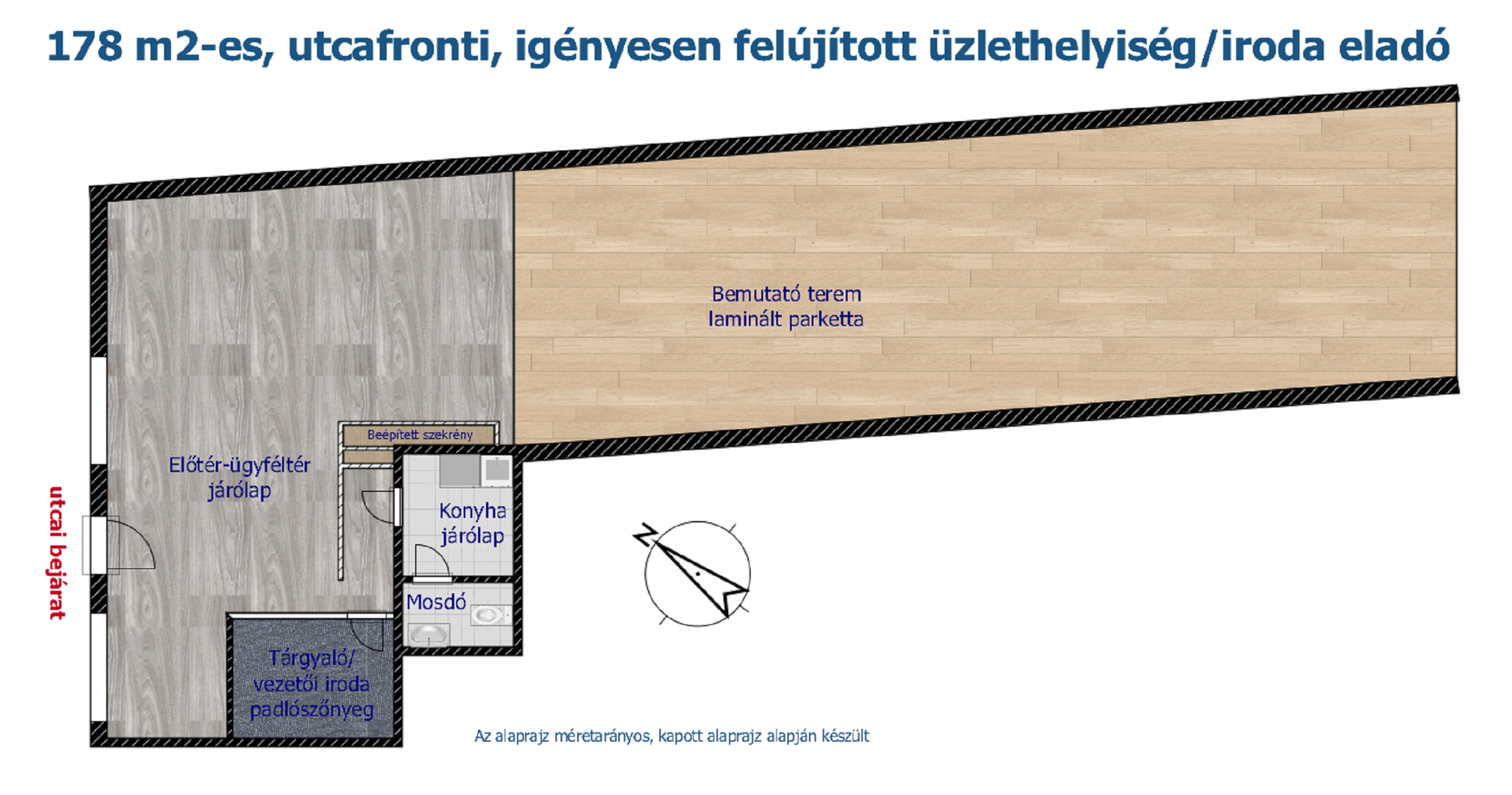A 178 m2-es ingatlanban van egy kb. 6 m2-es üvegfalú vezetői iroda/tárgyaló, egy konyha és egy mosdó, valamint a bemutatóterem hátsó részében elkülönített raktár, egyébként – az alaprajzon is látható módon – az ingatlan nagy része egy légterű.