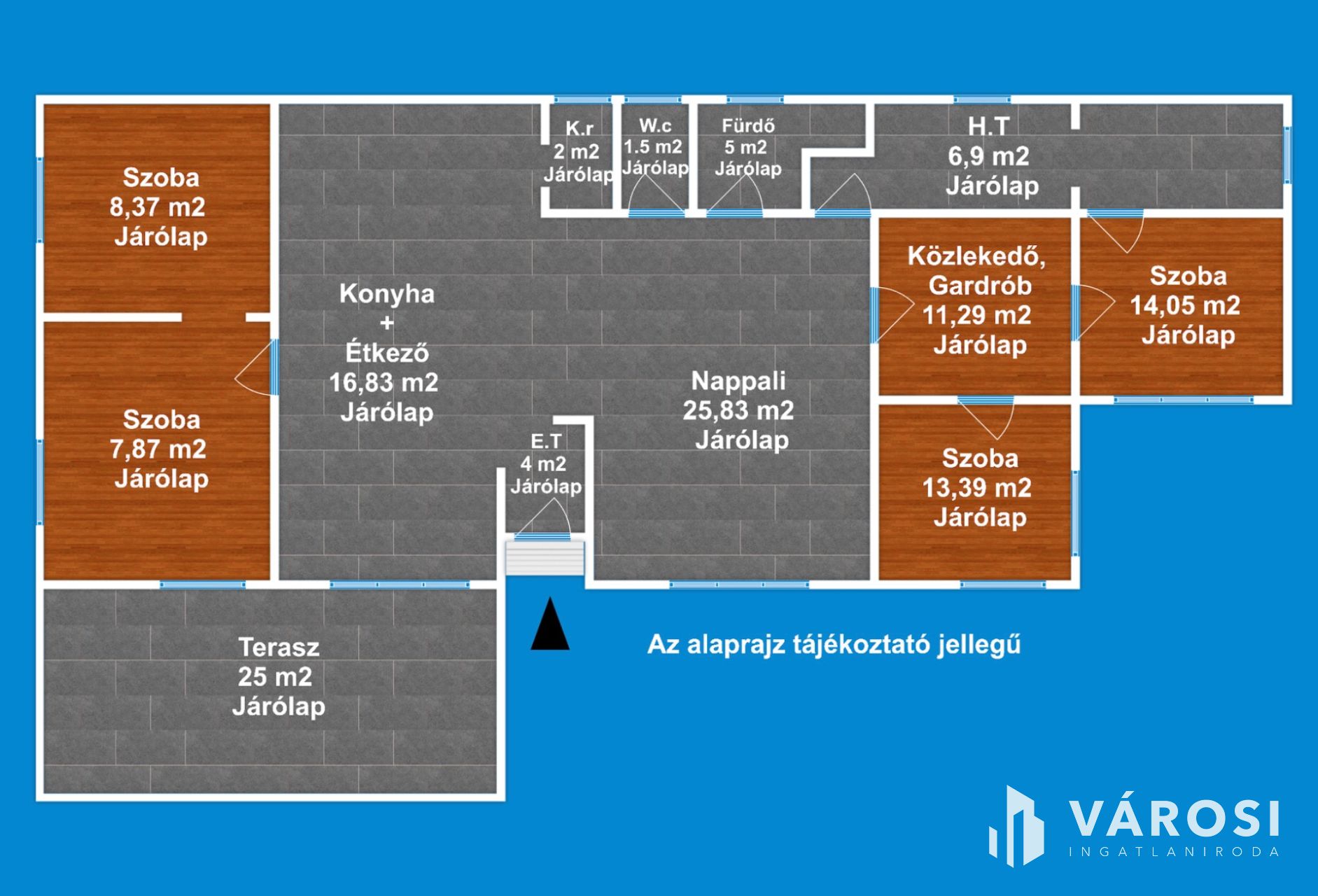 A lakás 1 db amerikai konyhás nappalival, 4 db hálószobával, 1 db fürdőszobával, külön Wc-vel, közlekedővel, előtéttel, gardóbbal terasszal rendelkezik.