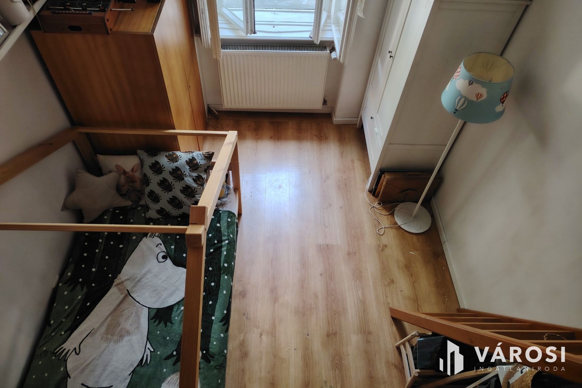 Az első emeleti függőfolyosóról a polgári stílusú lakás nagy méretű, 16 négyzetméteres konyhájába érkezünk. Innen nyílik a fürdőszoba és a szobákat összekötő közlekedő, ahonnan a három, külön bejáratú, egész szobát lehet megközelíteni. A nappali 20 négyzetméter, a hálószobák 12 négyzetméteresek és mind a kettőben egy 5 négyzetméteres galéria lett beépítve, a szobák járófelülete laminált padló. A vizes helyiségek hidegburkolattal vannak ellátva. A nyílászárók a szobákban a polgári stílushoz tartozó dupla, kétszárnyú faablakok az eredeti, csodálatos belső spalettákkal. A lakás folyosó felöli oldalán a bejárati ajtó cserélve lett, új biztonsági záras műanyag nyílászáróra, a konyha ablak pedig, új faablak, hőszigetelt üveggel. Kombi kazán adja a melegvizet a mindennapokhoz és a radiátorokba.