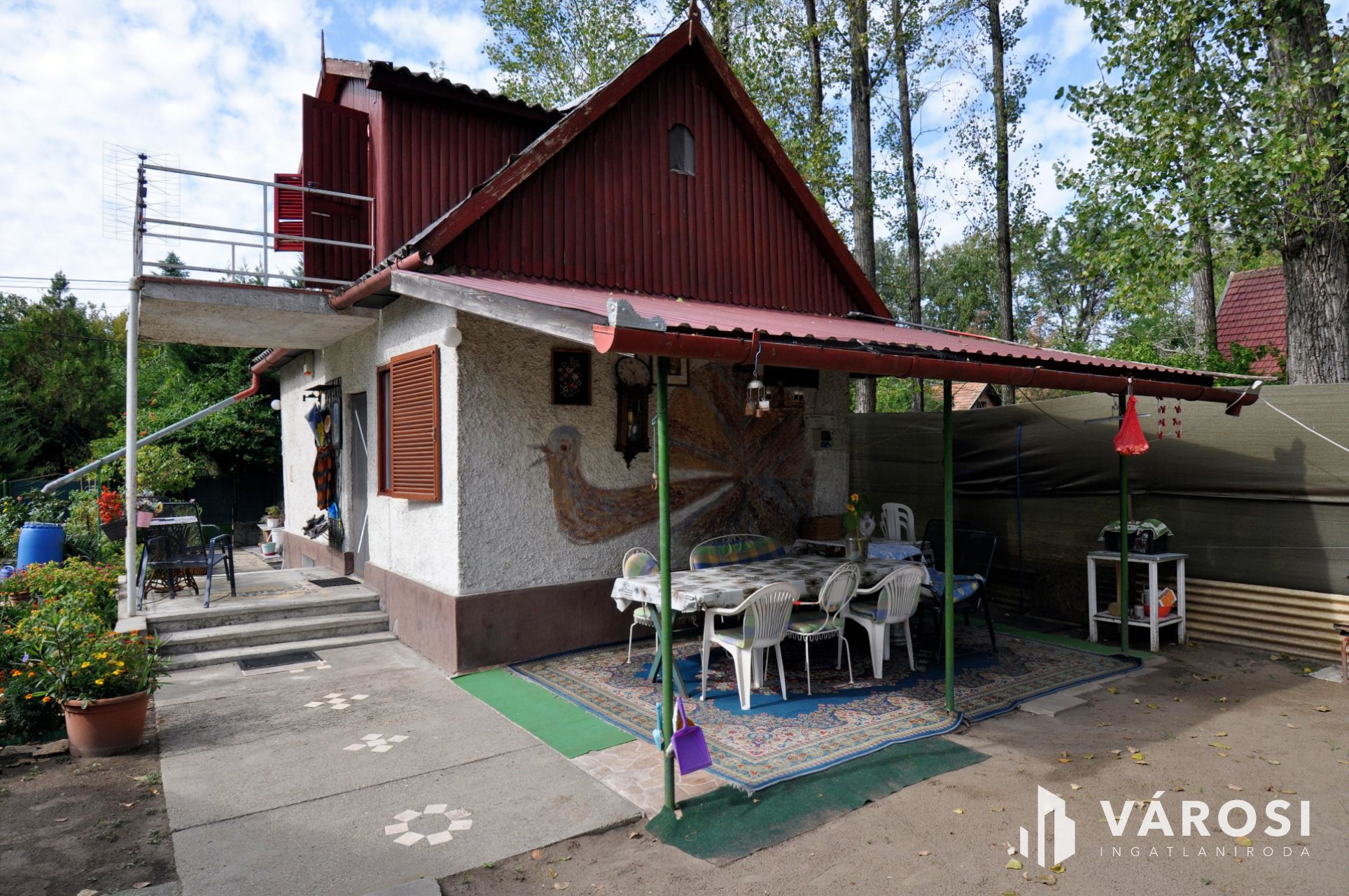 Szeged-Sziksóstón, a Bordányi út közelében / a Sziksóstói strand közelében kínálunk eladásra egy 720 m2 alapterületű gondosan ápolt telken lévő üdülőt, melyen egy jó állapotban lévő, kb. 45 m2 nagyságú, kétszintes, beépített tetőteres, kivaló adottságokkal rendelkező ház található a földszinten előtérrel, járólapos konyhával, kamrával, fürdőszobával és napfényes, tágas hálószobával, míg a tetőtérben egy előszoba és két hálószoba, valamint egy gyönyörű kilátást nyújtó erkély kapott helyet.
