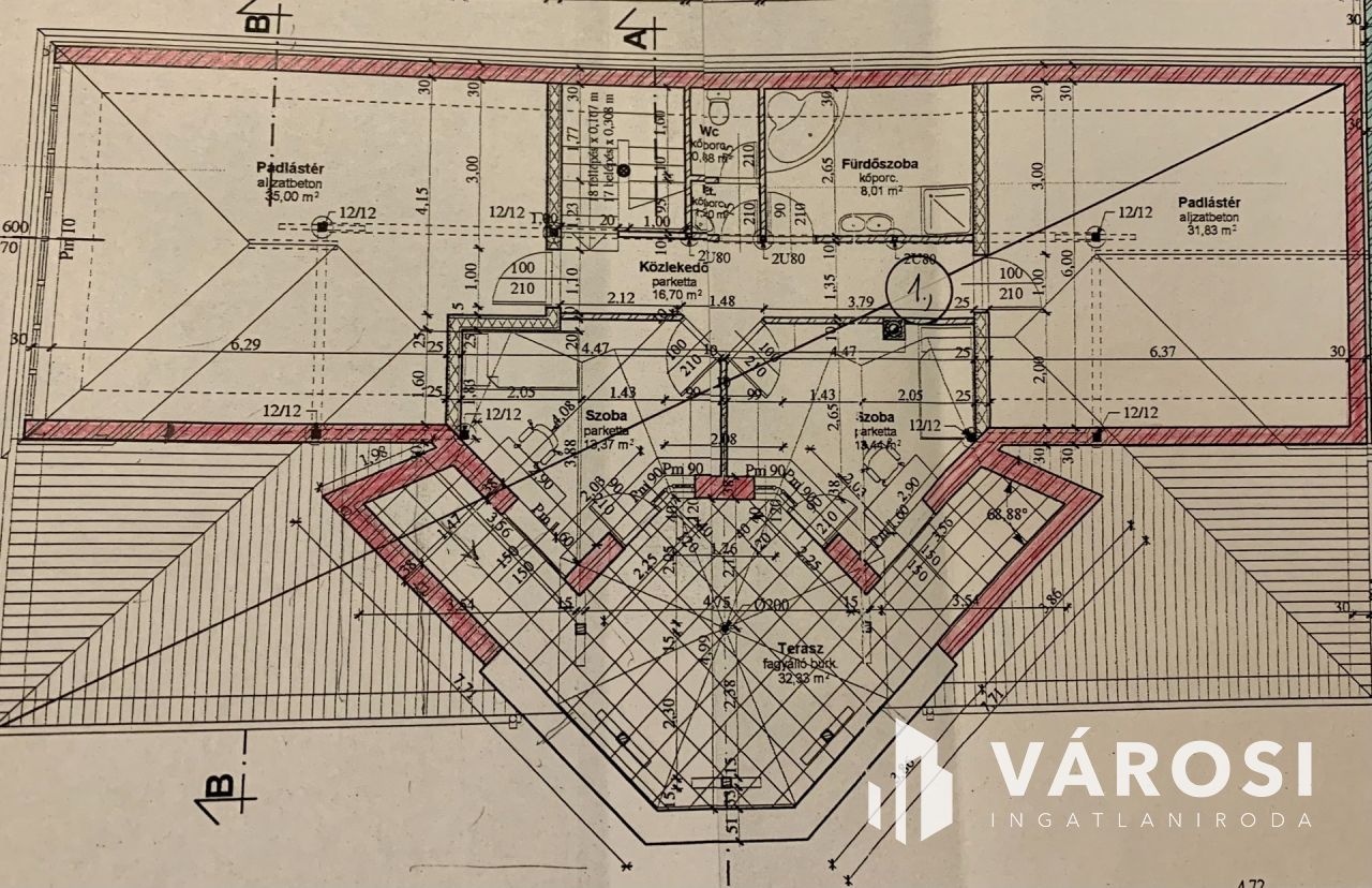 - 4 szoba (35, 13, 13, ill 32 m2-esek)- két szoba szőnyegpadlós, külön kijáratokkal az emeleti teraszra, a két nagyobb aljzatbetonos, befejezendő