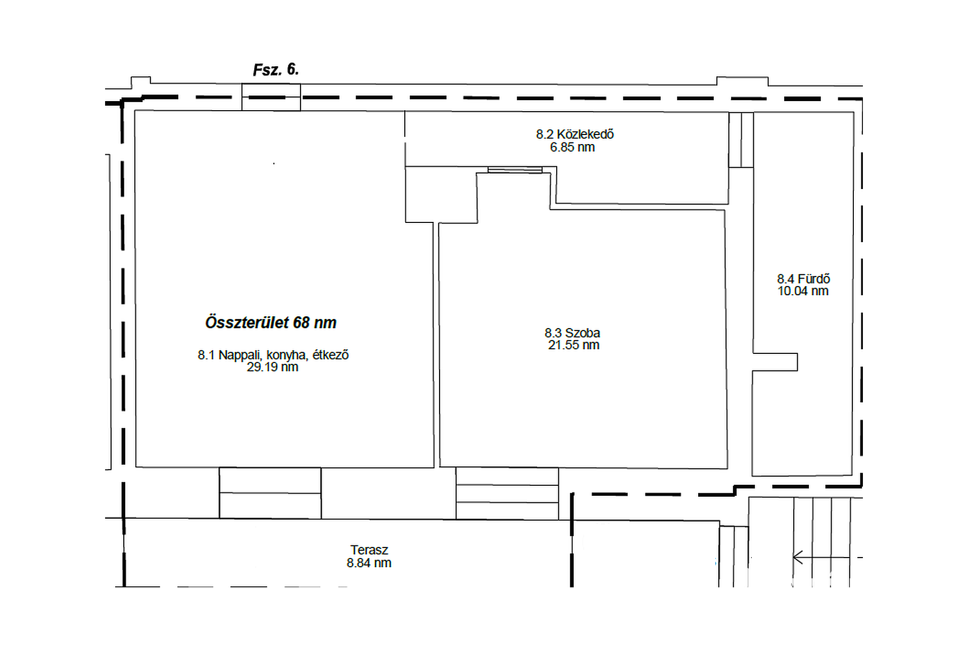 A földszinten levő 68 négyzetméteres 6. lakás a következő helyiségekkel kerül kivitelezésre: nappali, szoba, konyha, fürdőszoba, WC és egy 9 négyzetméteres terasz. Ára: 68 512 500 Ft