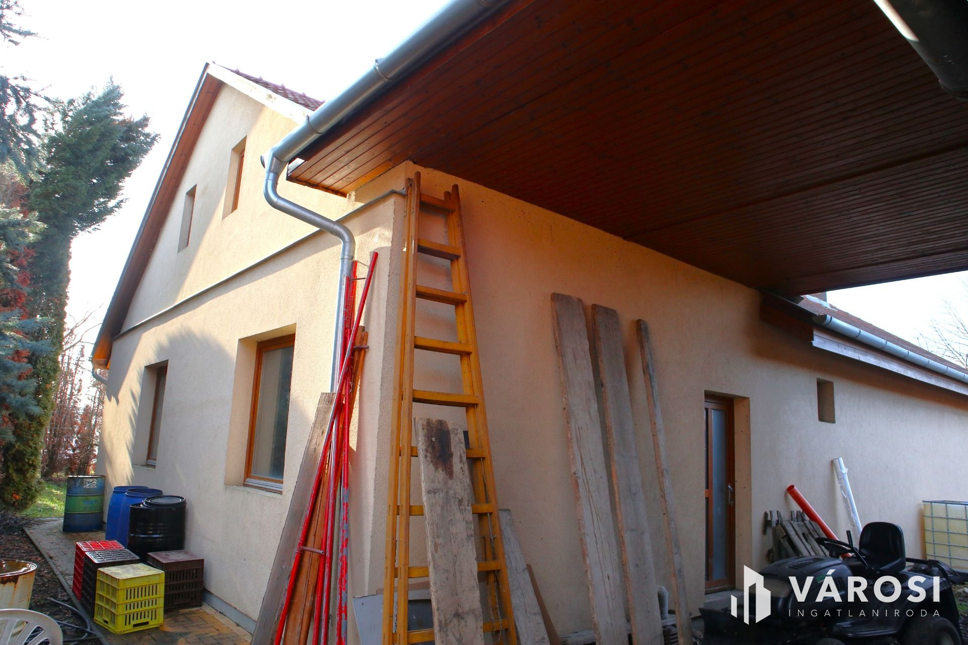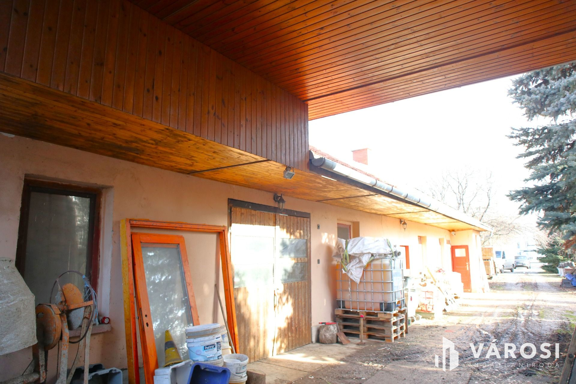 + 50m2-es fedett terasz oszlopokkal, mennyezetét borovi fenyővel burkolták,