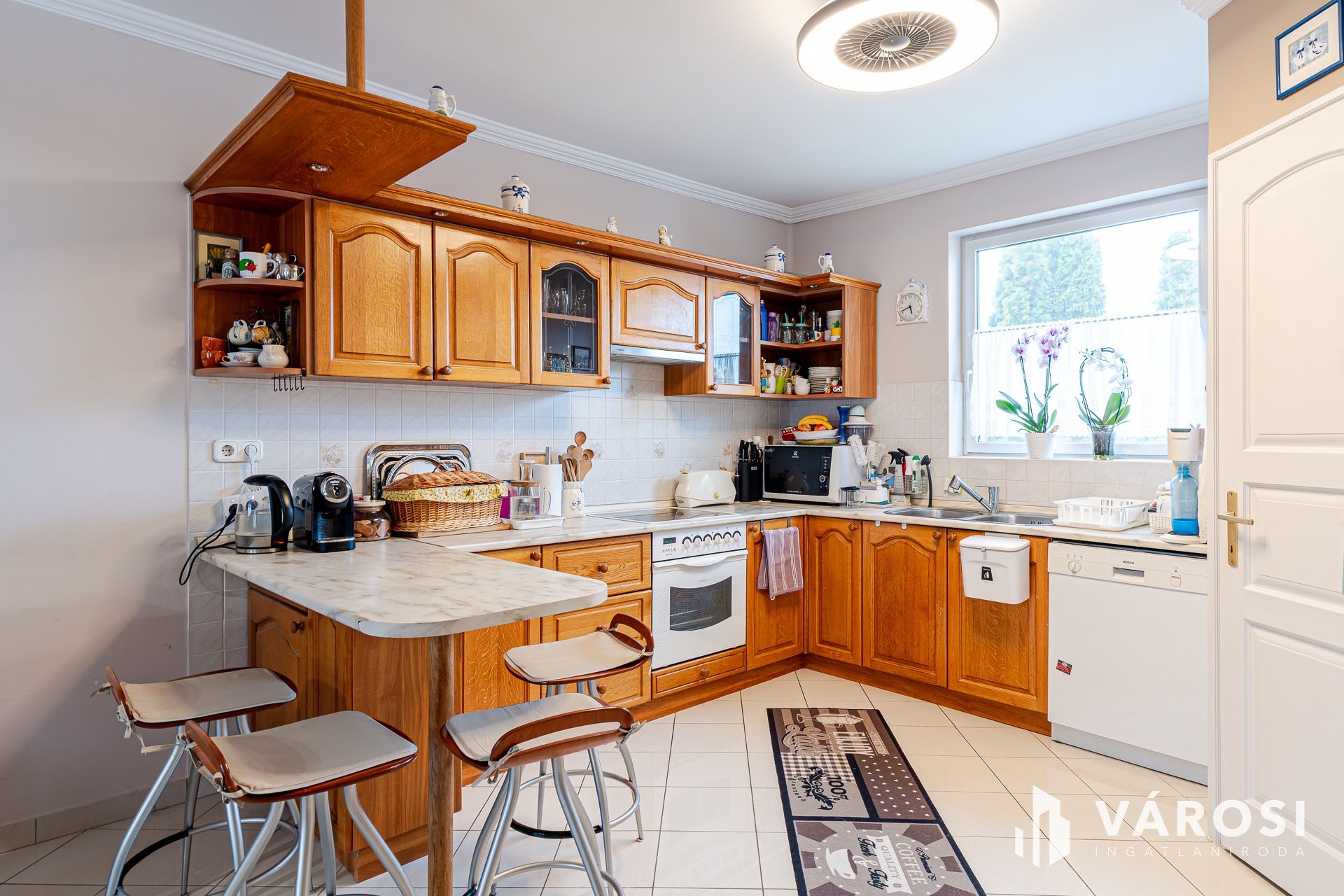 ​Középső szint: Világos, hatalmas L-alakú amerikai konyhás nappali, külön kamra, kádas fürdőszoba és külön WC.
