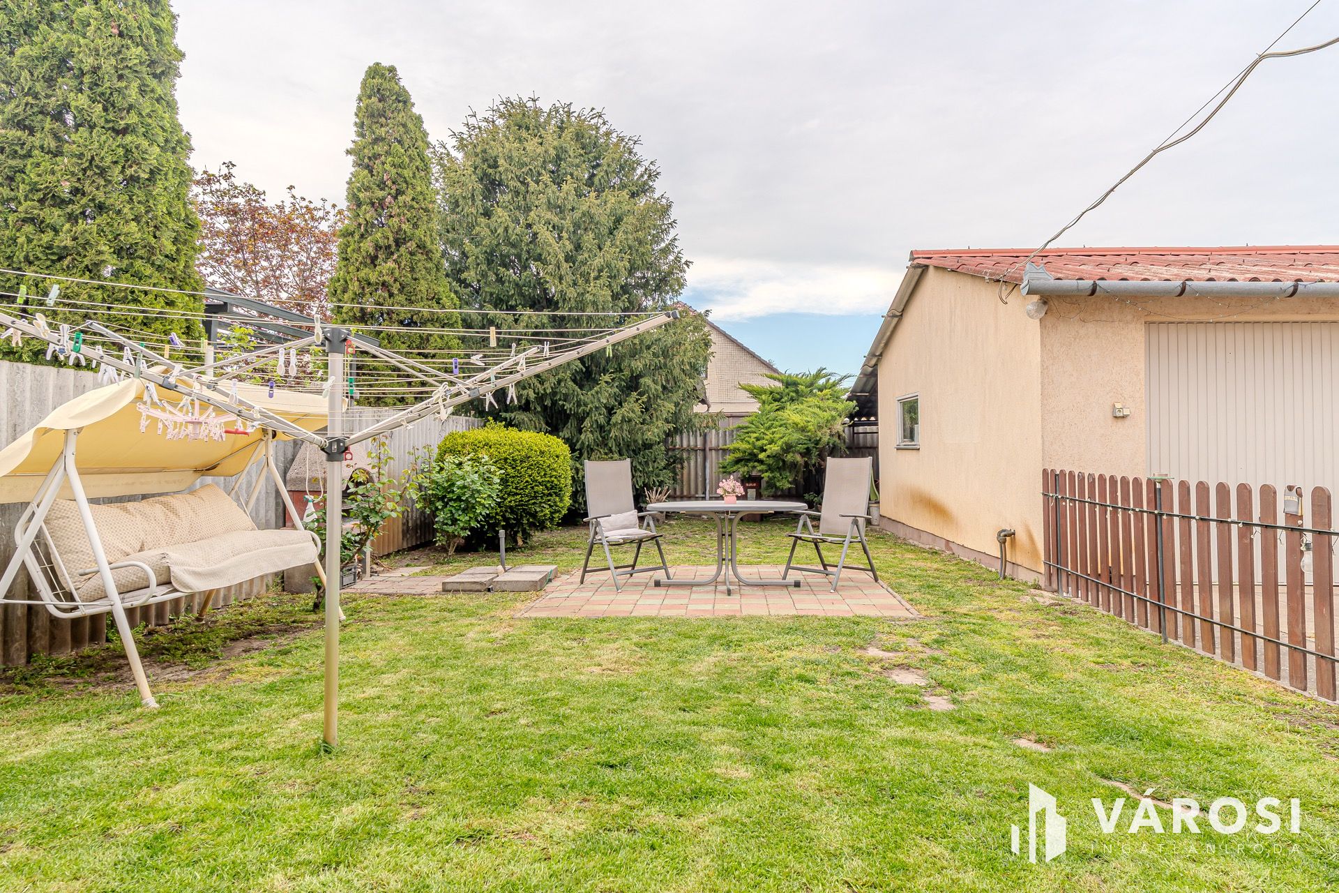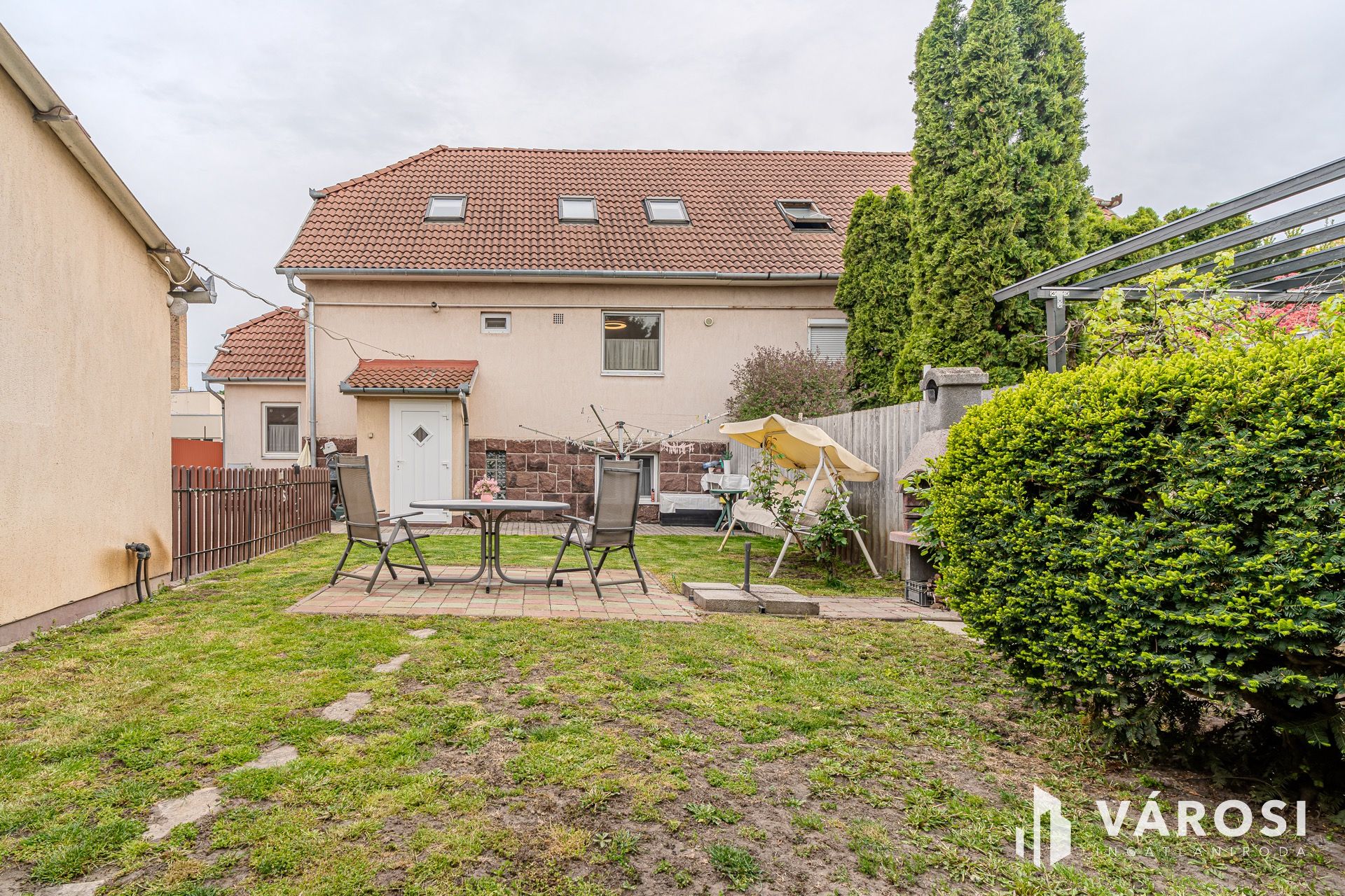 ​A 435 nm-es telek hátsó részén parkosított pihenőkert található. Az udvar igényesen térkövezett, a bejutást pedig elektromos kapu teszi kényelmessé.