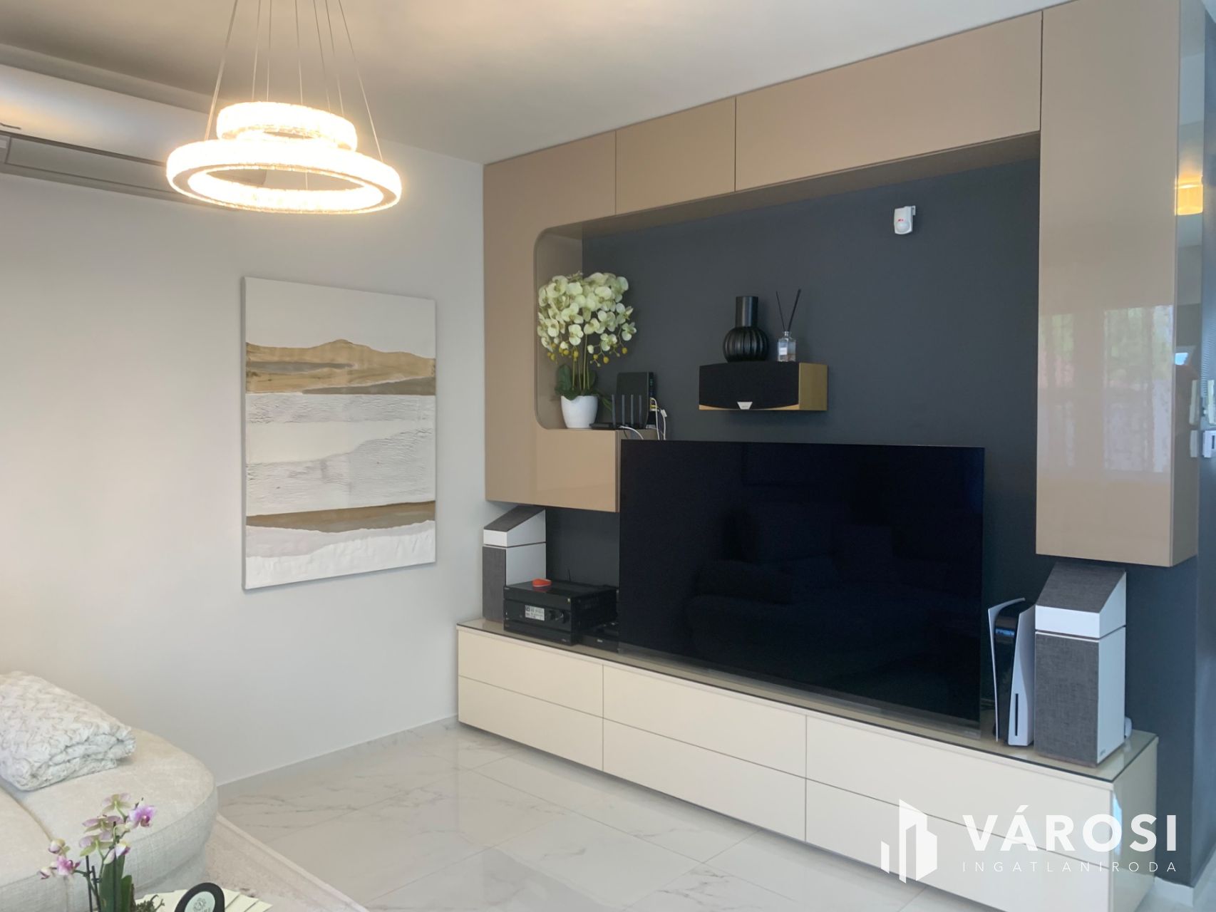 Nappali: Exkluzív olasz ülőgarnitúra, márvány dohányzóasztal, óriás LG okos TV, 5.1-es házimozi rendszer és PlayStation 5 konzol a prémium kikapcsolódásért.