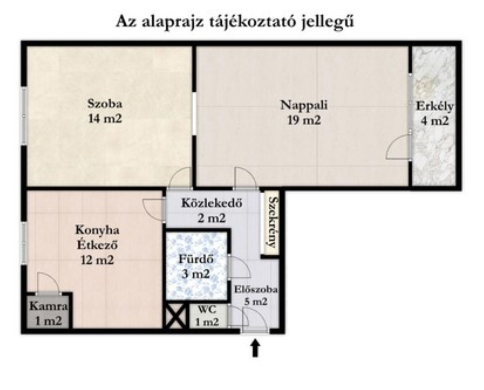 Az 57 m² klasszikus, jól kihasználható elrendezést ad: nappali, hálószoba, konyha, fürdő, külön wc, kamra, valamint beépített szekrény található benne. A helyiségek külön nyithatók, kényelmesen bútorozhatók, a lakás átlátható és praktikus.