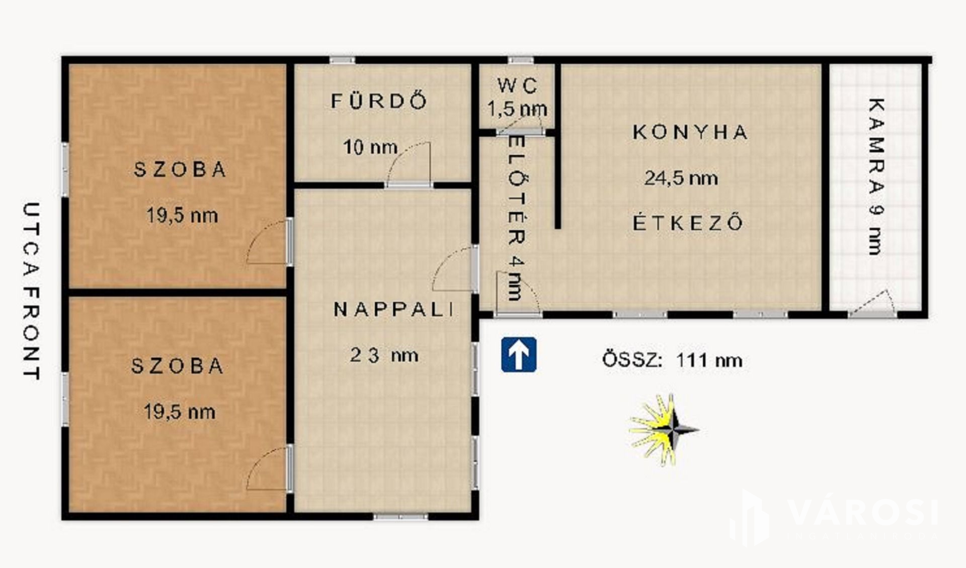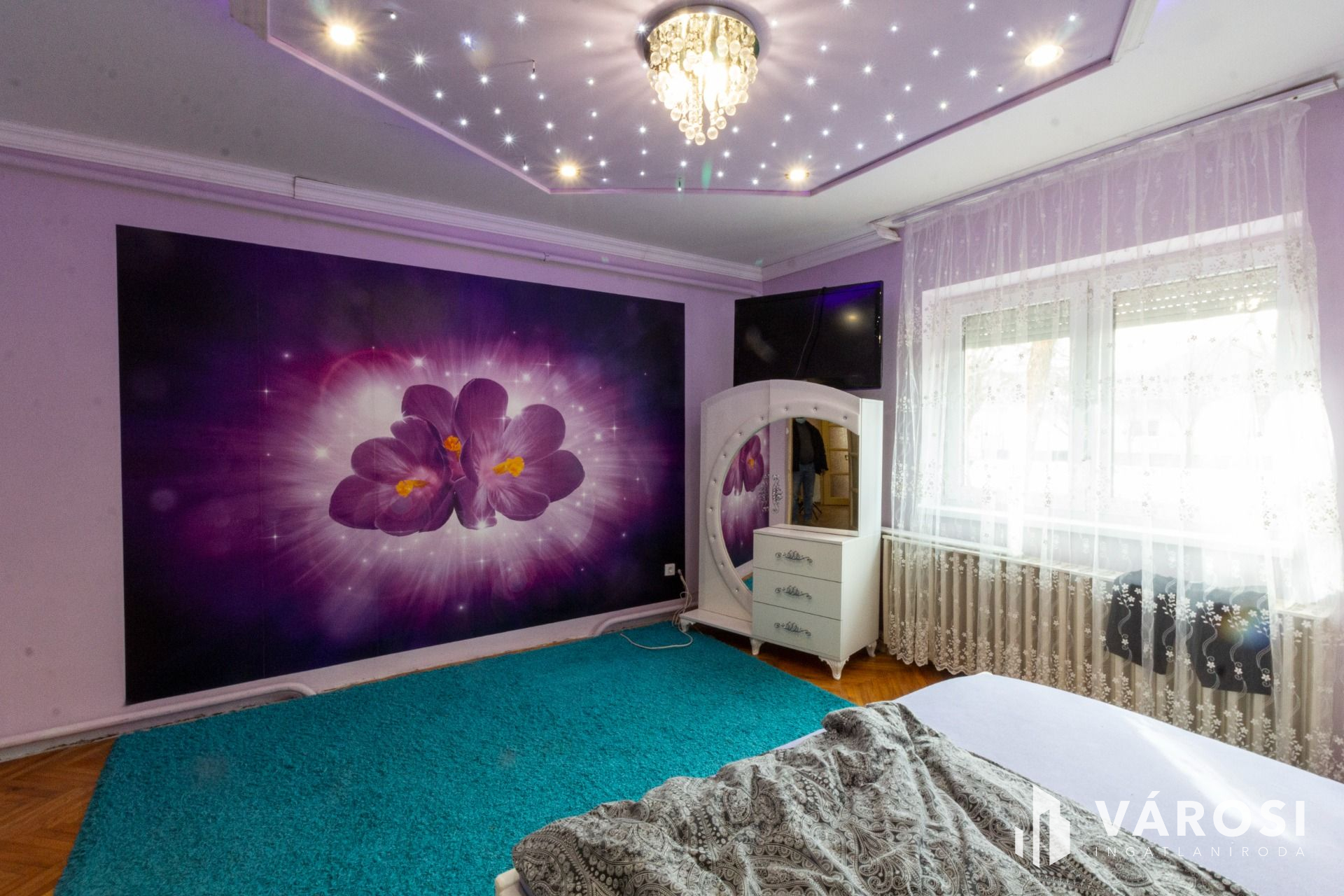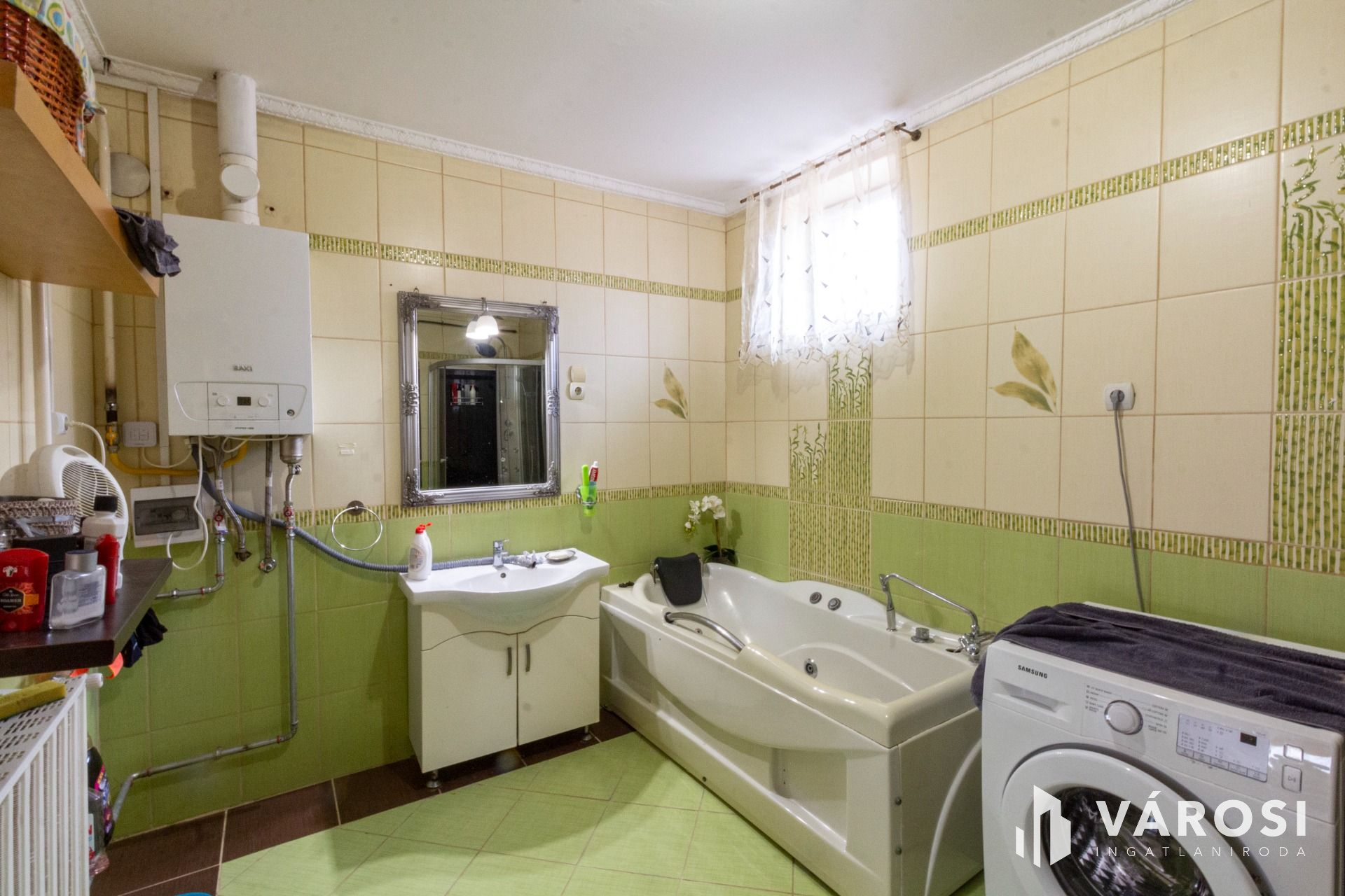 A lakásba belépve jobbra az amerikai konyhás étkező, balra pedig a nappali található, amelyből további két szoba nyílik. A szobák parkettások, a többi helyiség hidegburkolatú. Az L alakú ingatlan hátsó részében, külön bejáratú apartman lett kialakítva. Albérletnek kiadható lakrész.