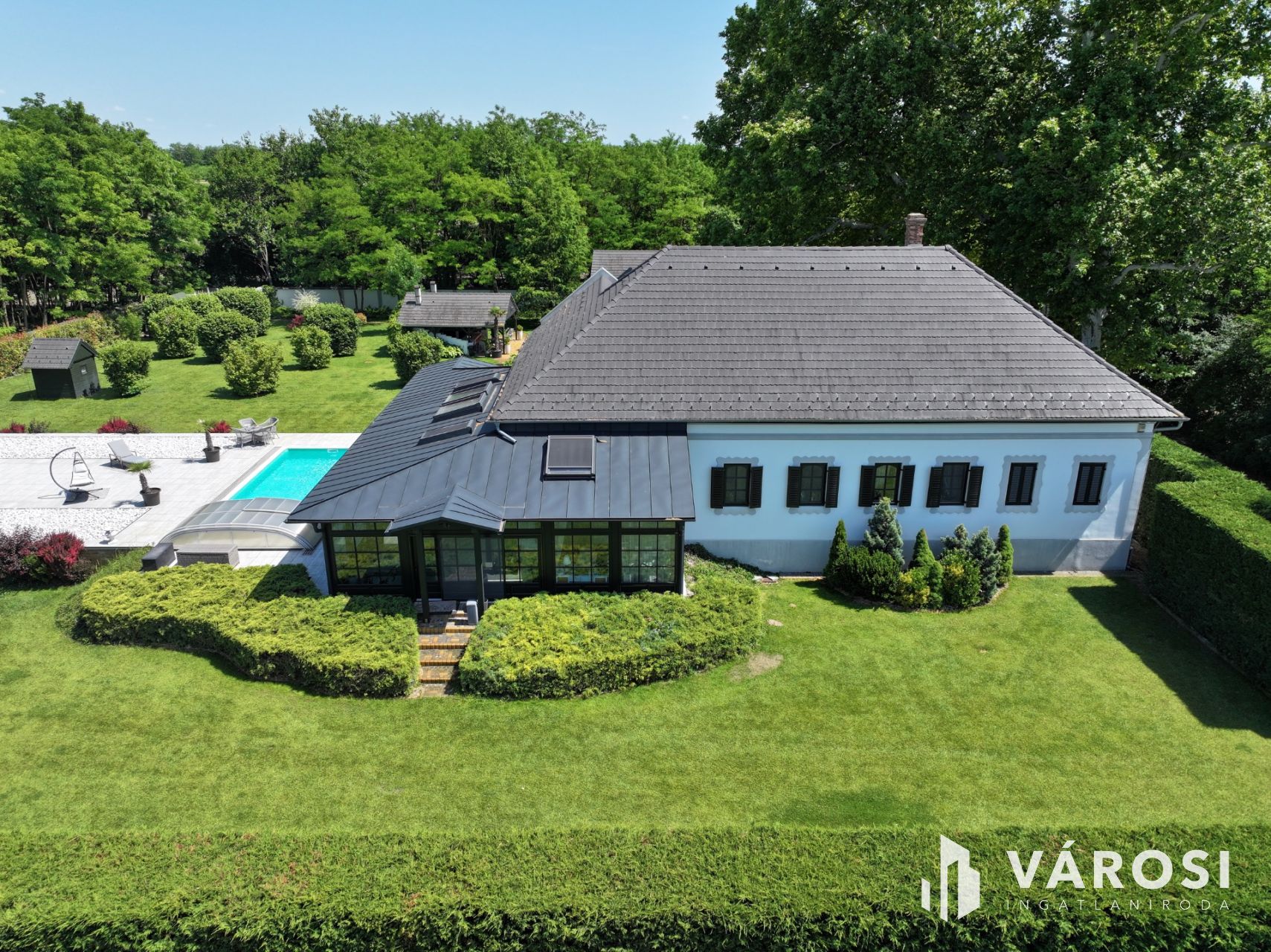In the peaceful, tranquil setting of Zsombó, a manor house accessible via a private road and completely free from through traffic awaits its new owner. The impressive manor, built between 1903 and 1905 and meticulously renovated, offers 333 m² of living space, 4 bedrooms, 3 bathrooms, a walk-in closet, a huge living room, and a large enclosed terrace, all evoking a true aristocratic lifestyle. The residence stands on a stunning, landscaped 4,500 m² plot, which is also for sale with an additional acacia grove (3,875 m²), a 600 m² utility building, and a 667 m² private road.