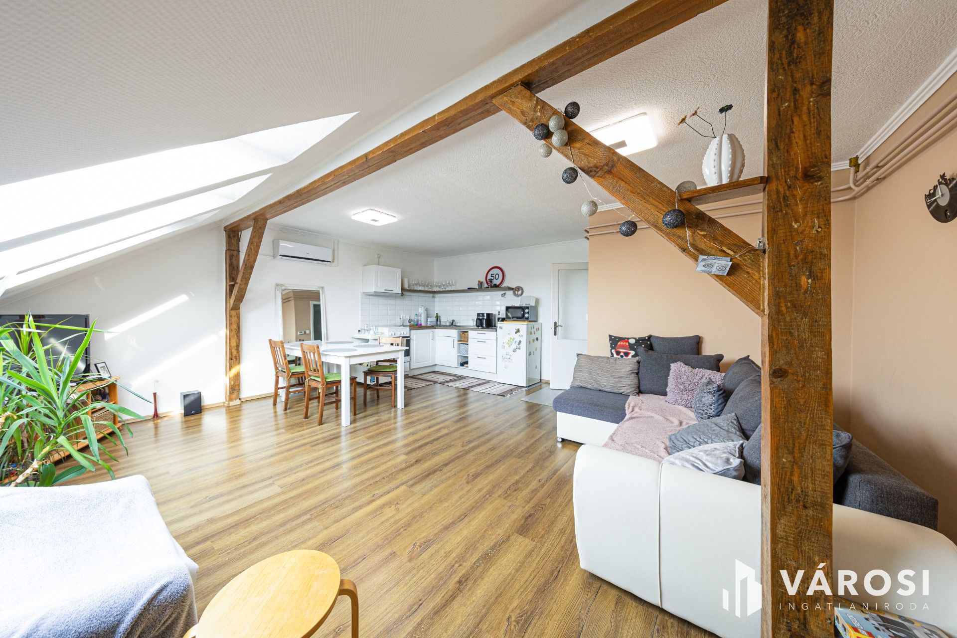 Látszó fagerendás tetőtéri lakás csendes utcában
