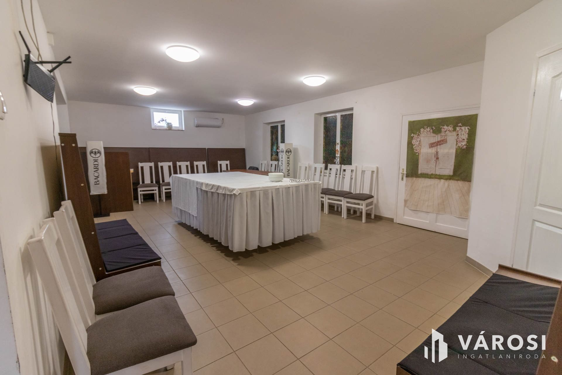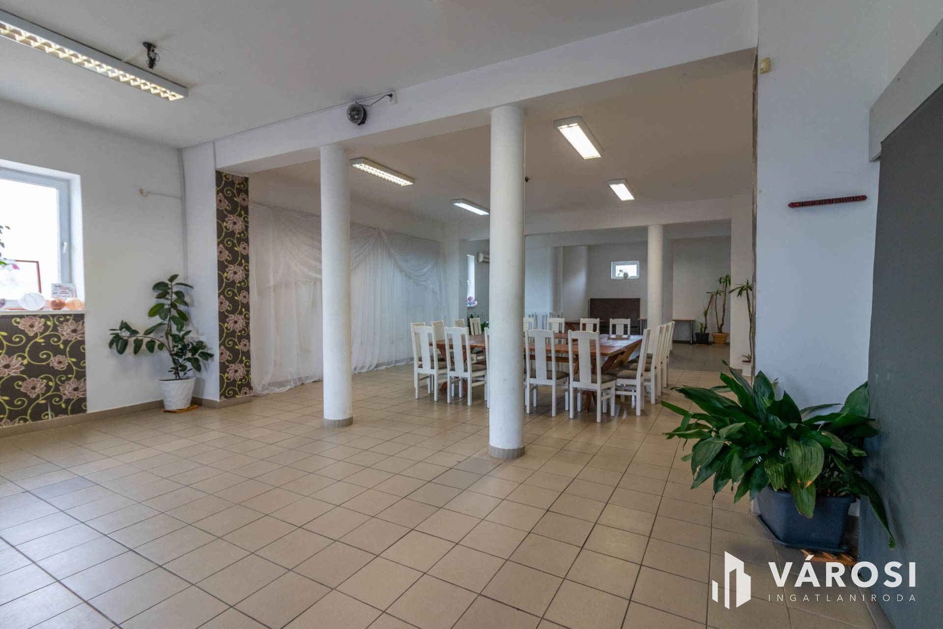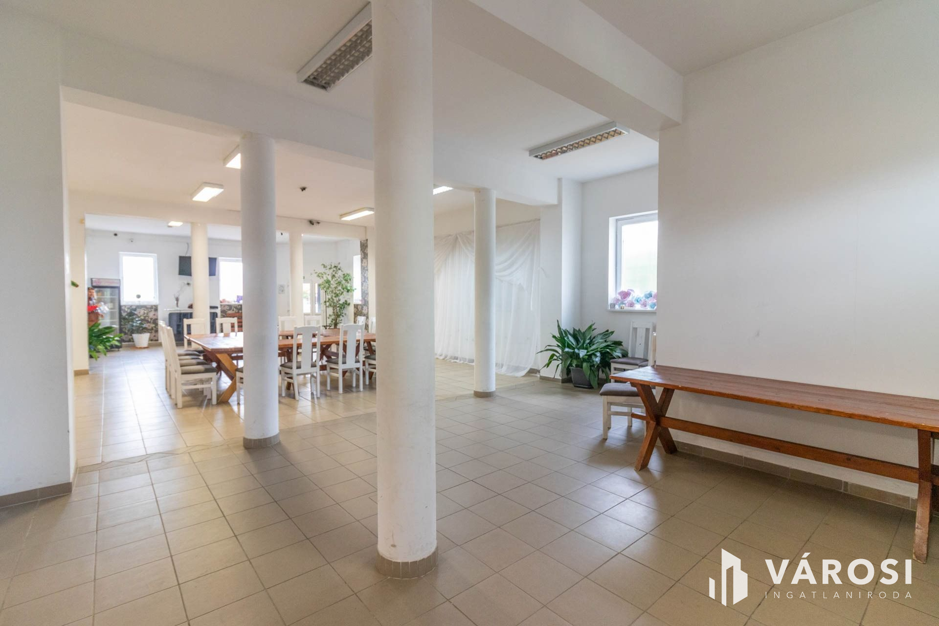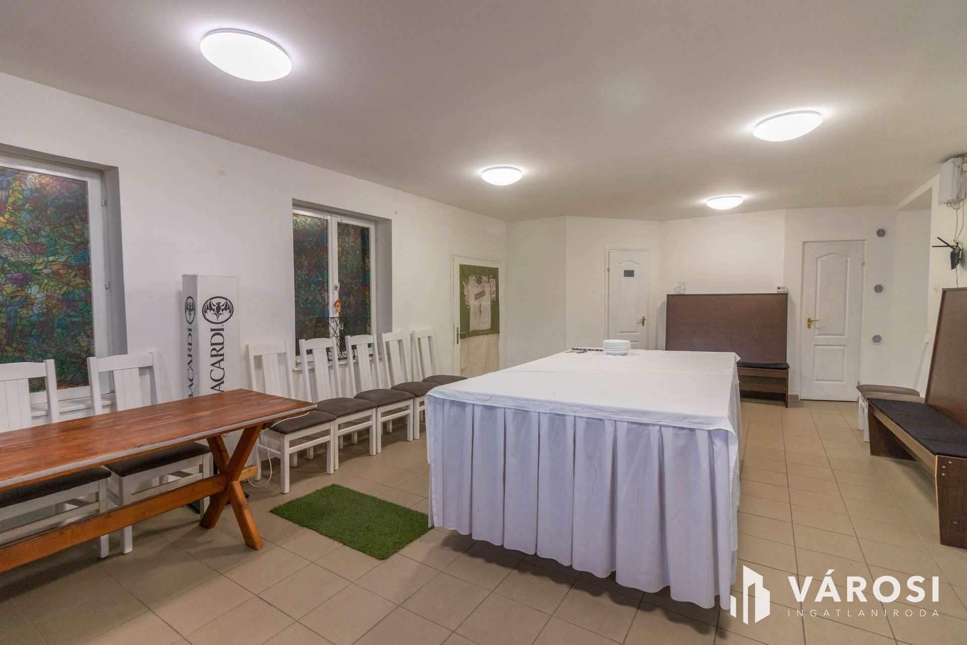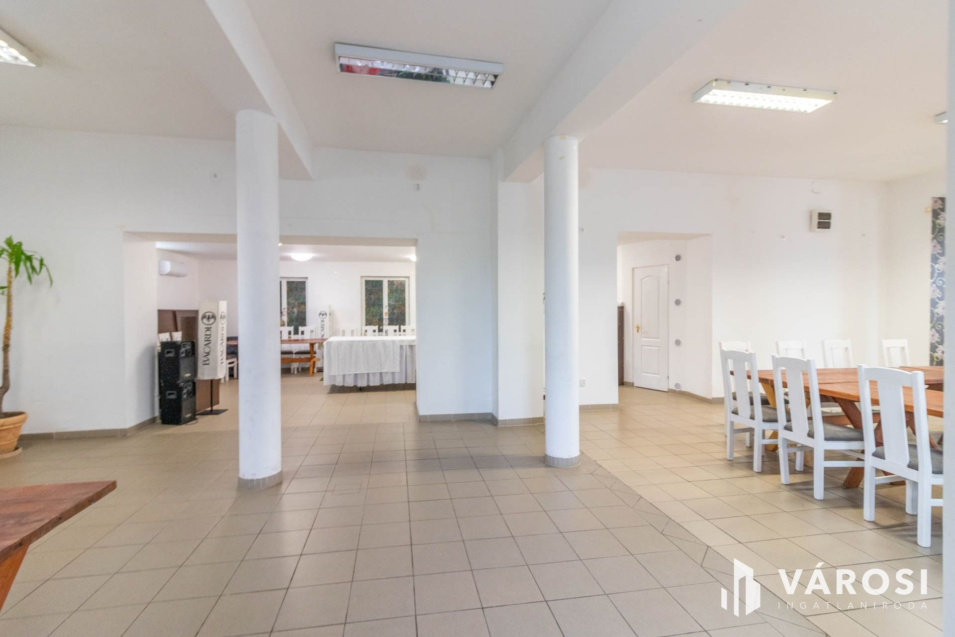 Az ingatlan 2 szintes, az alsó szinten egy 70 főt befogadó rendezvényterem található, a felső szinten pedig az udvarról megközelíthető 76 négyzetméteres, nappali+2 hálószobás lakás található. Ezek mellett a 2 szinten több raktározásra és vendéglátáshoz szükséges helyiség van.