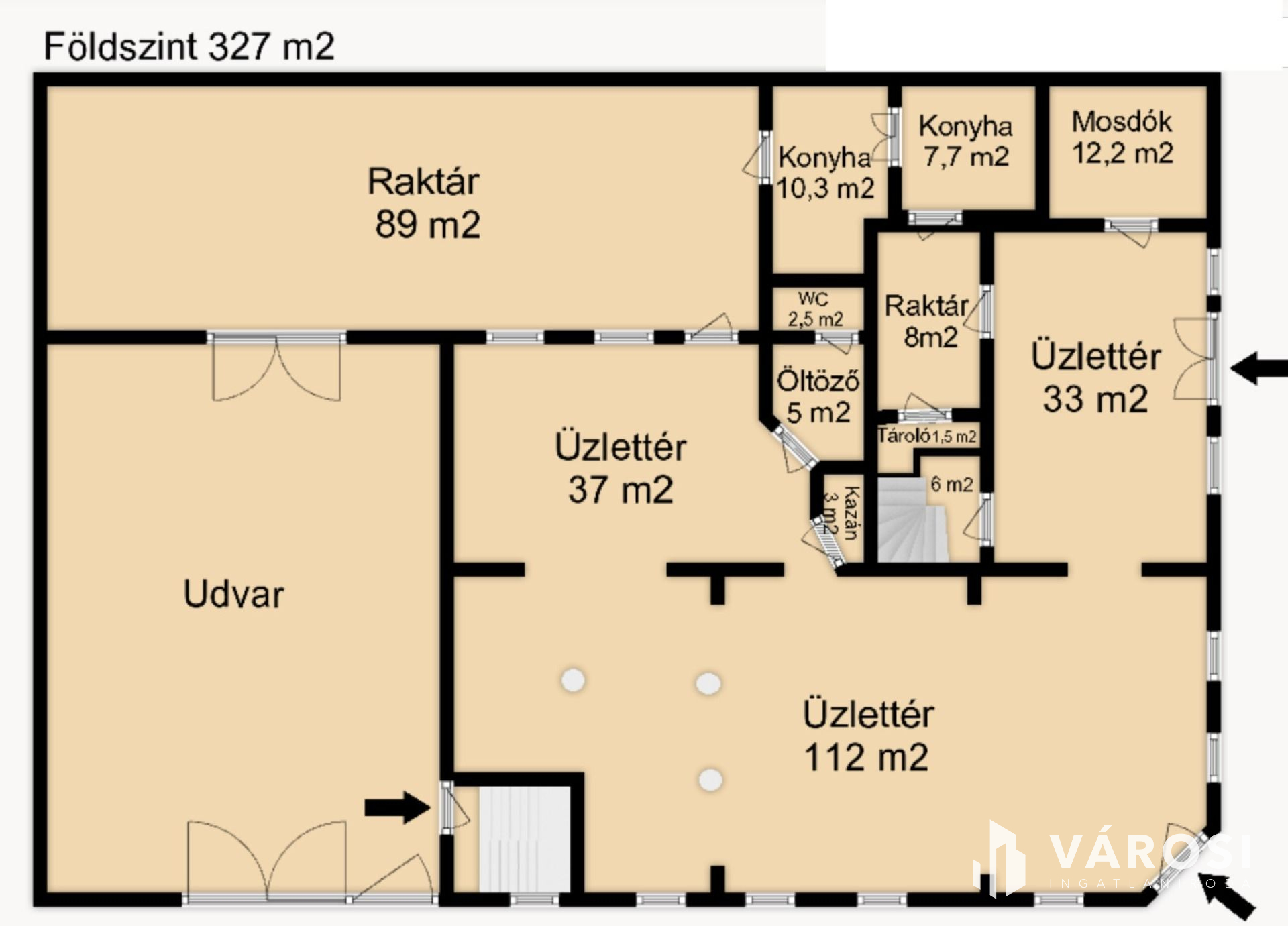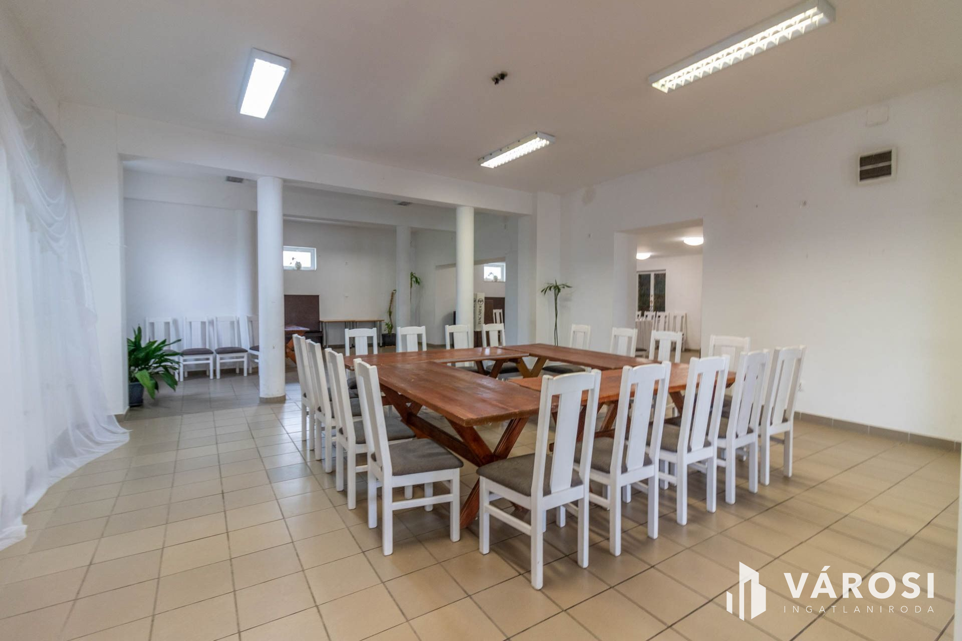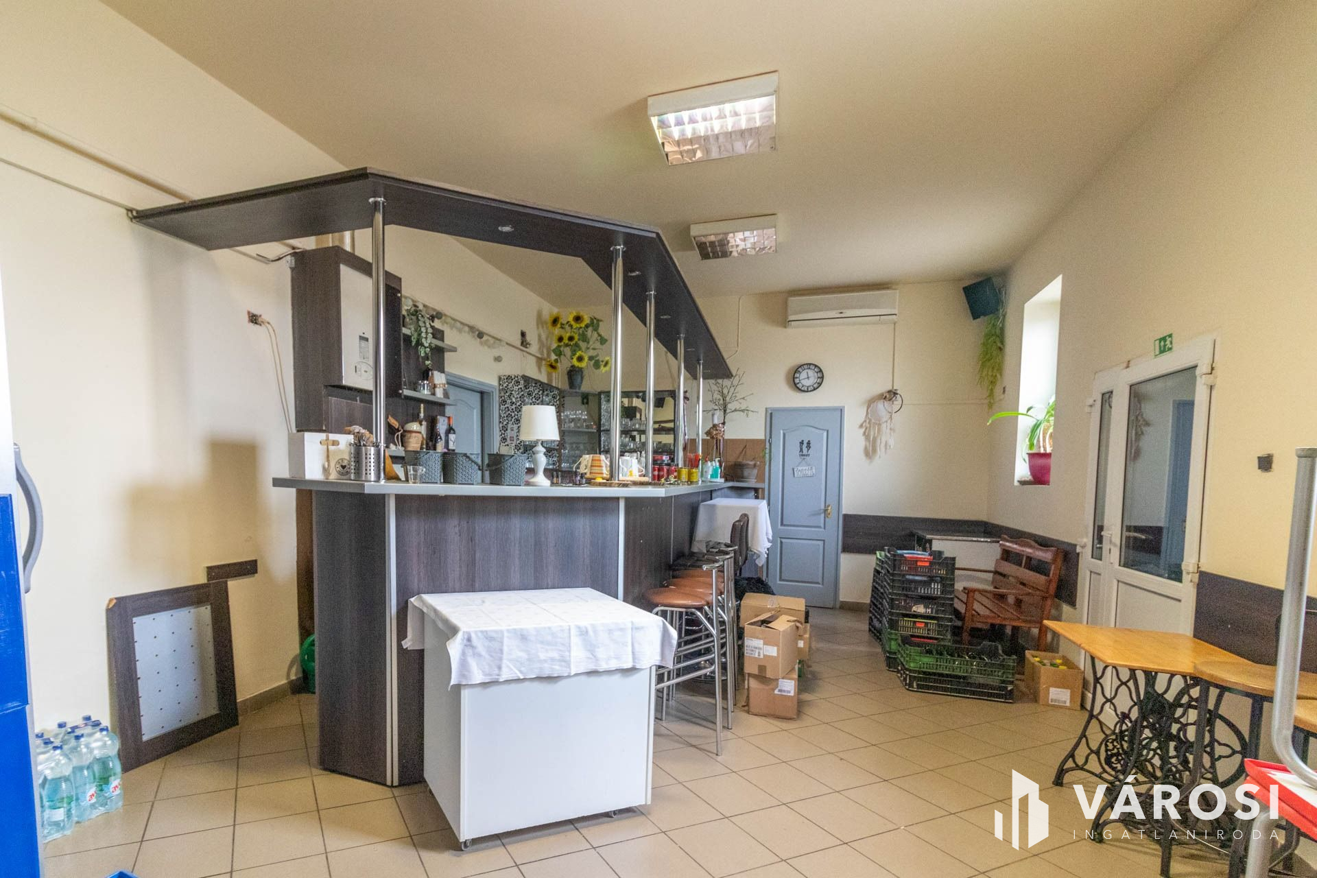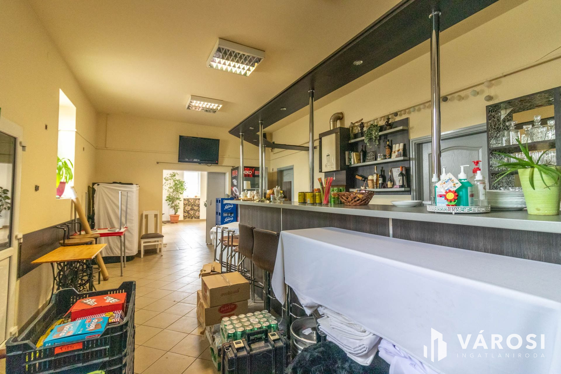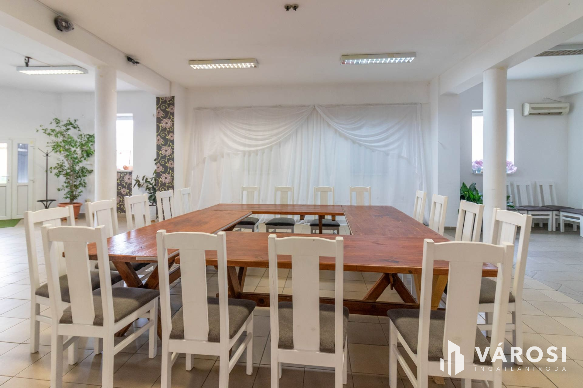 Az ingatlan 2 szintes, az alsó szinten egy 70 főt befogadó rendezvényterem található, a felső szinten pedig az udvarról megközelíthető 76 négyzetméteres, nappali+2 hálószobás lakás található. Ezek mellett a 2 szinten több raktározásra és vendéglátáshoz szükséges helyiség van.