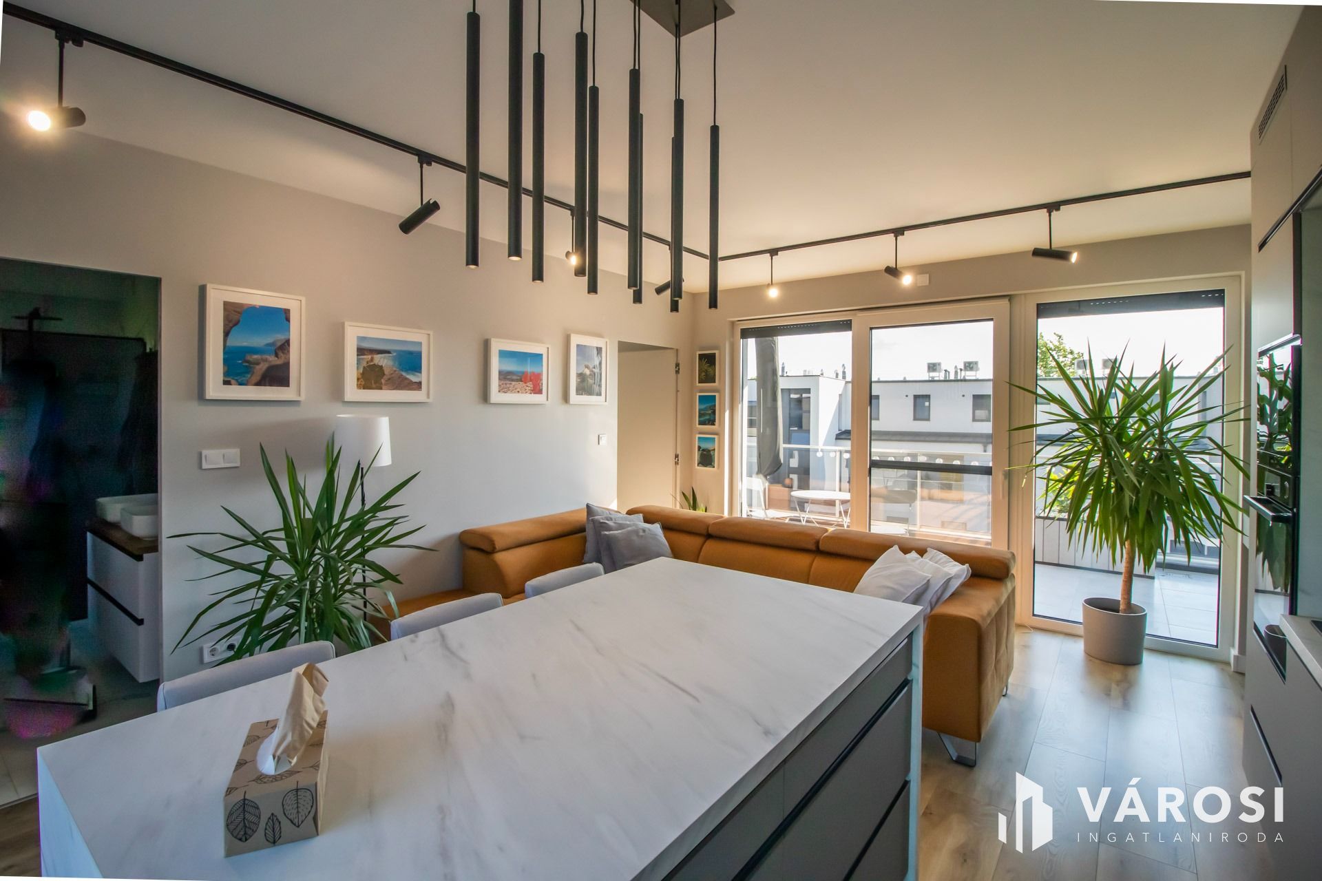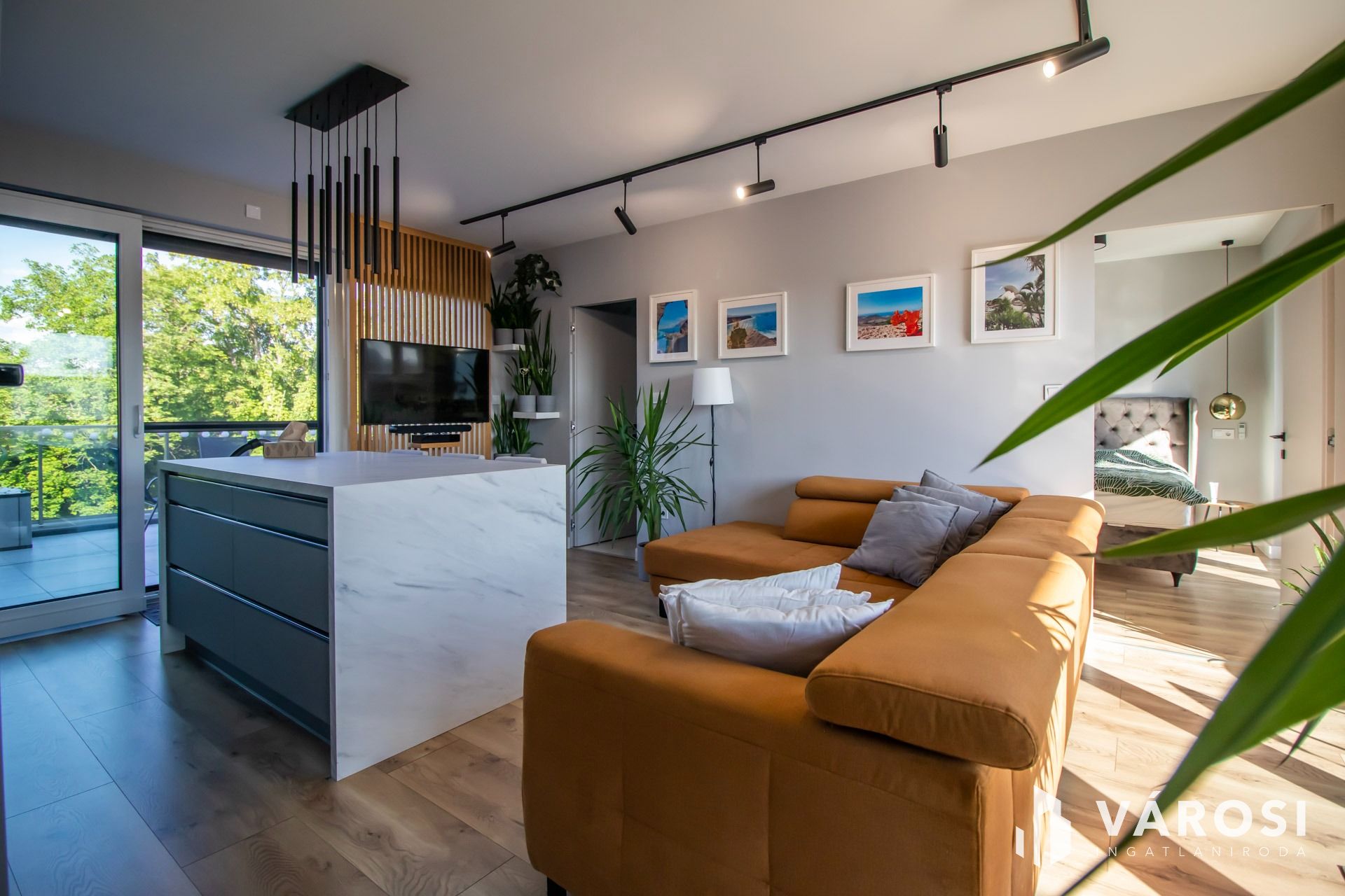 A konyhabútor is méretre készült és a legkorszerűbb gépekkel van felszerelve, amik természetesen itt maradnak szintén. A nappaliban igényes ülőgarnitúra csábít a pihenésre, tévézésre.