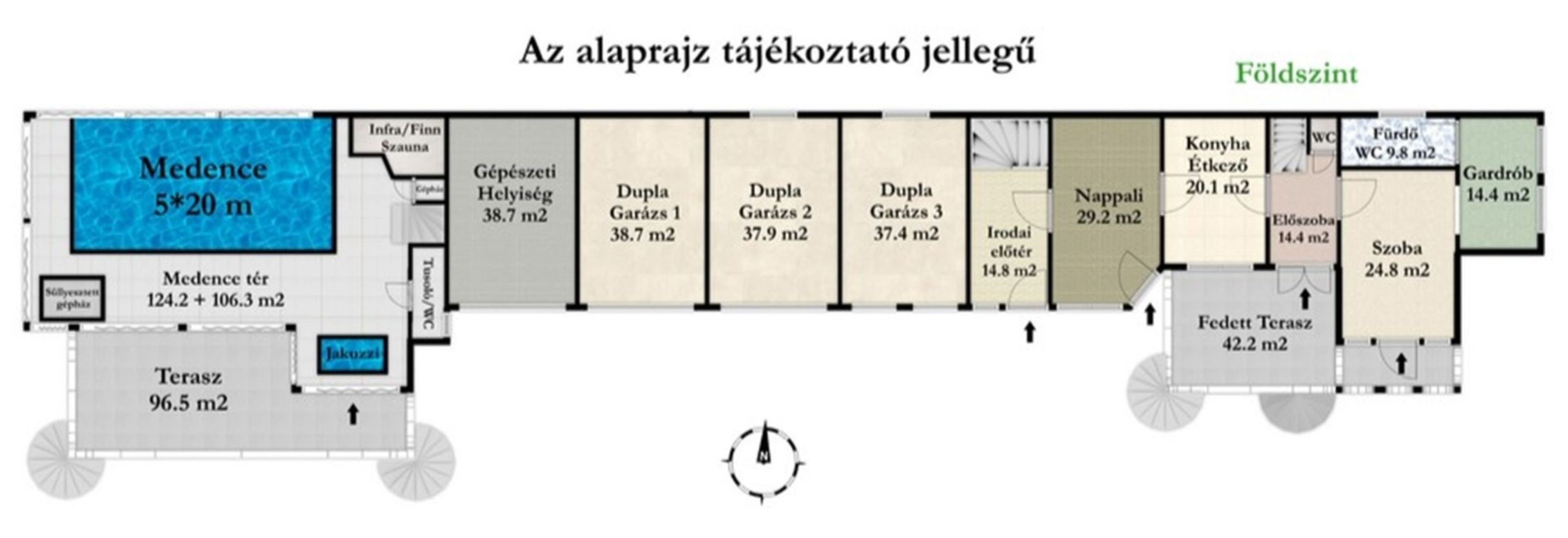 Földszint: Kettő terasz, egyik üvegtetővel és automatikus árnyékolórendszerrel, infra hősugárzókkal, hogy az év minden napján élvezhető legyen, másik teljesen automatán vezérelhető oldal és tetőárnyékolókkal felszerelve.