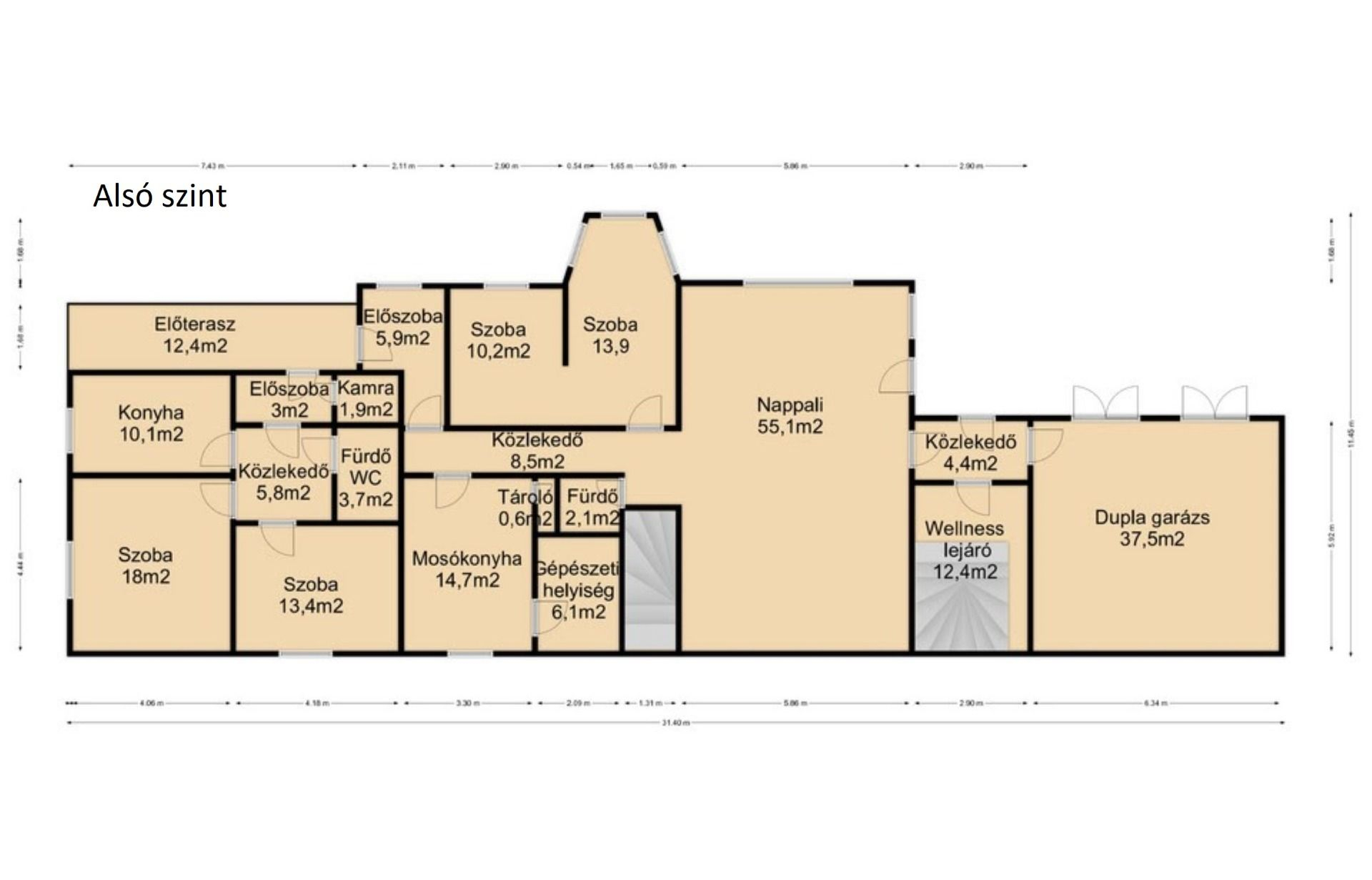 Földszint: 1 nagy négyzetméterű és 1 kis négyzetméretű külön bejáratú lakrész. (Igény szerint akár két generációnak)
