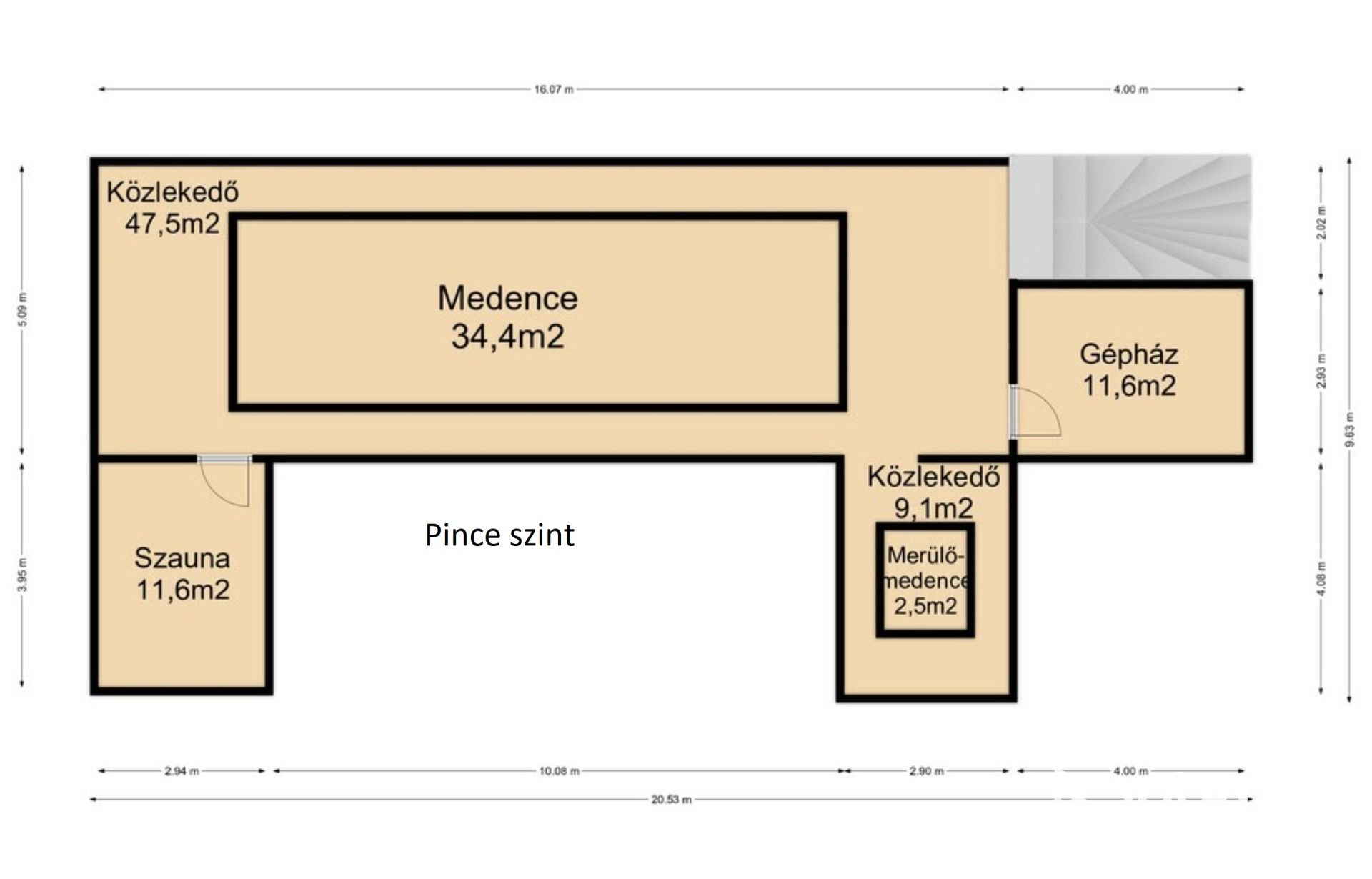 Pinceszint: (megközelítőleg 8m-re a föld alatt) 154m2 - Wellness részleg, nagy méretű medencével, szaunával, merülő medencével, gépészeti helységgel.