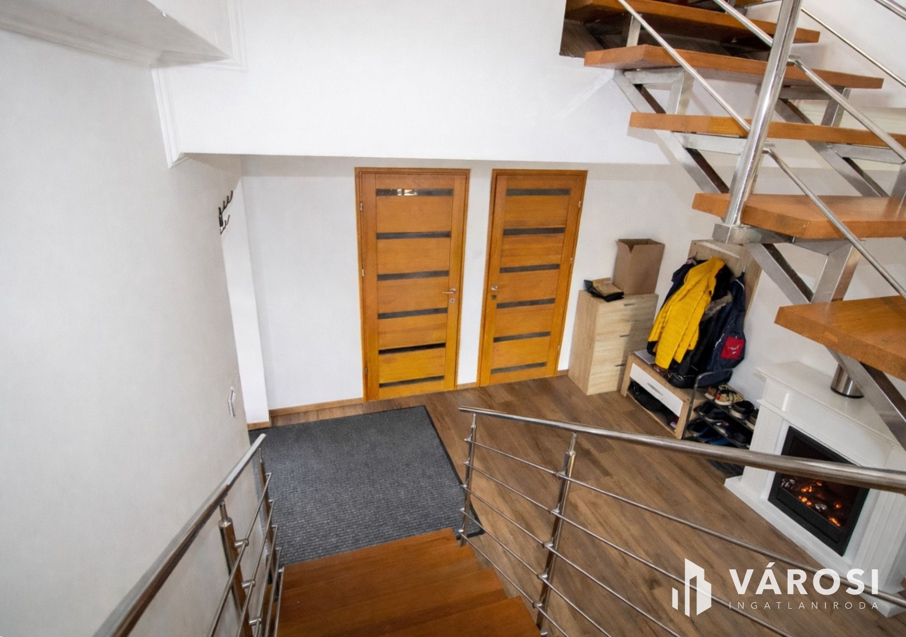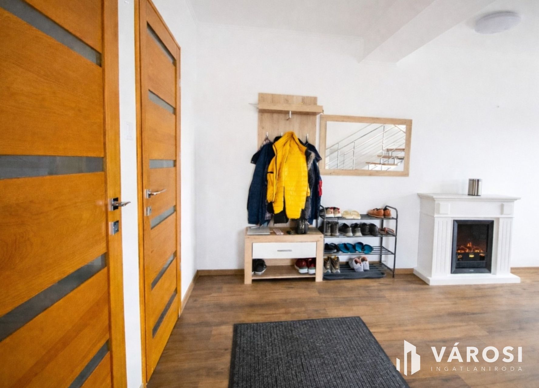 A belső tér kialakítása kifejezetten tágas és átgondolt. A bejáratnál egy hangulatos, kandallóval ellátott előtér fogad, itt találunk egy külön mosdót és zuhanyzós fürdőt. Innen lépcső vezet az emeleti lakótérbe. A felső szinten egy konyha-étkező, egy közel 40 négyzetméteres nappali, négy hálószoba, gardrób, kamra, mosókonyha, külön WC, valamint egy sarokkádas és zuhanyzós fürdőszoba került kialakításra. A felhasznált anyagok mindenhol prémium minőséget képviselnek, a nyílászárók – beleértve a Velux tetőtéri ablakokat – szintén magas kategóriát képviselnek.