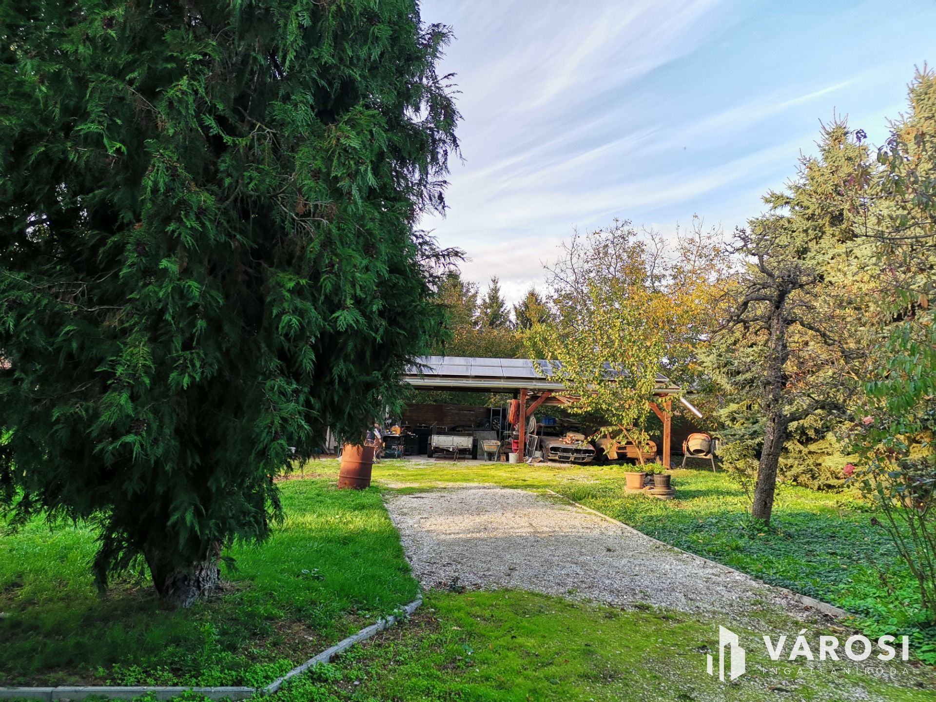 Parkosított, romantikus kert veszi körül a házat. A ház mögött félig fedett terasz, garázs és hátul egy 3 autó számára alkalmas fedett beálló is van.