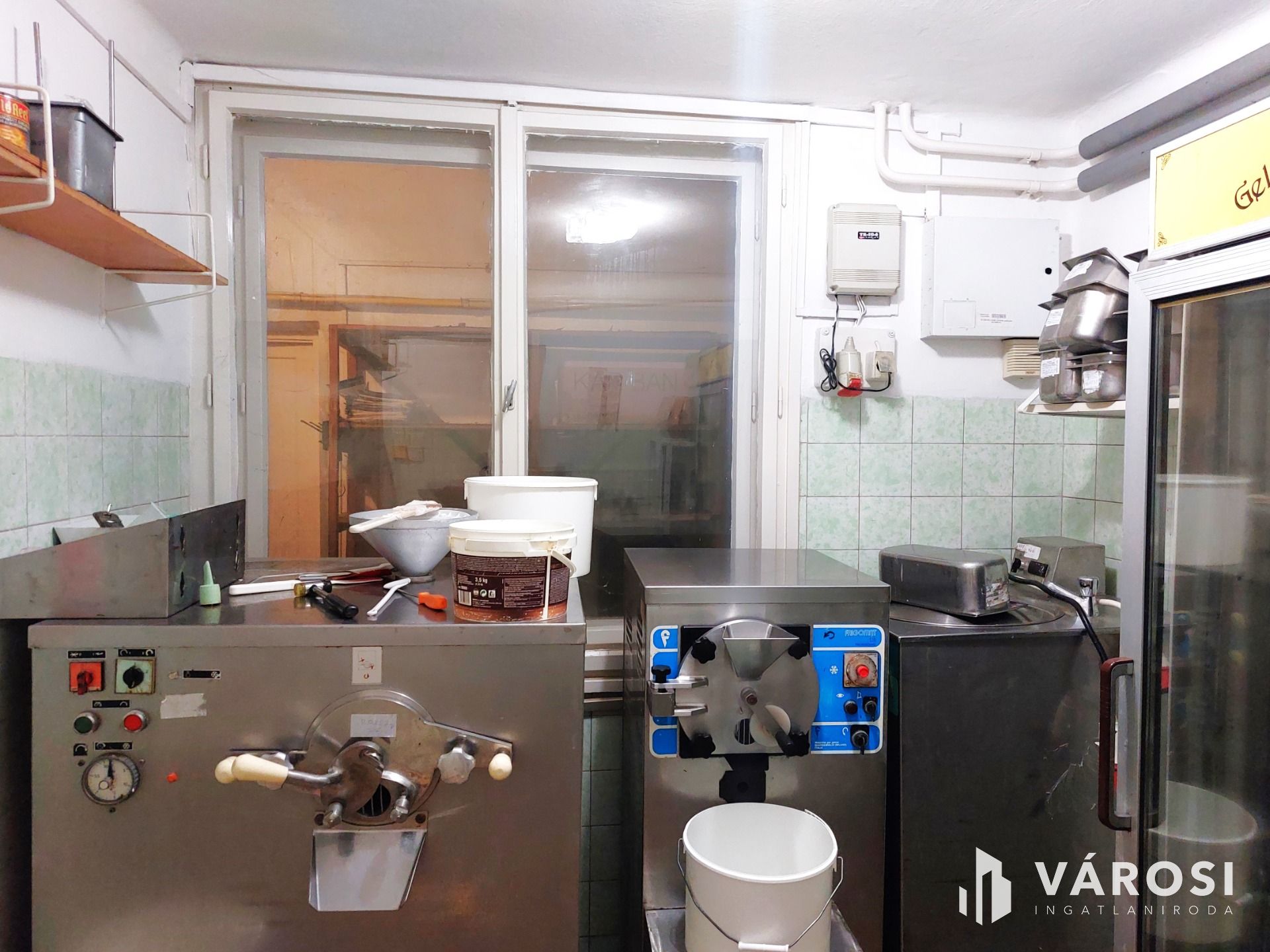 A földszinten, 83m2 alapterületen a több, mint 40 éve működő, ma is népszerű Jókai Cukrászda, amelyhez a melléképületben kialakított, professzionális berendezésekkel felszerelt cukrászüzem tartozik. A városban és környékén szervezett nagy rendezvényekre, esküvőkre a süteményeket többnyire innen rendelik. A cukrászatban használt különleges olasz fagyigépek, pasztőröző gépek és más specifikus cukrászüzemi berendezések, felszerelések magas értéket képviselnek, melyet az eladási ár tartalmaz.