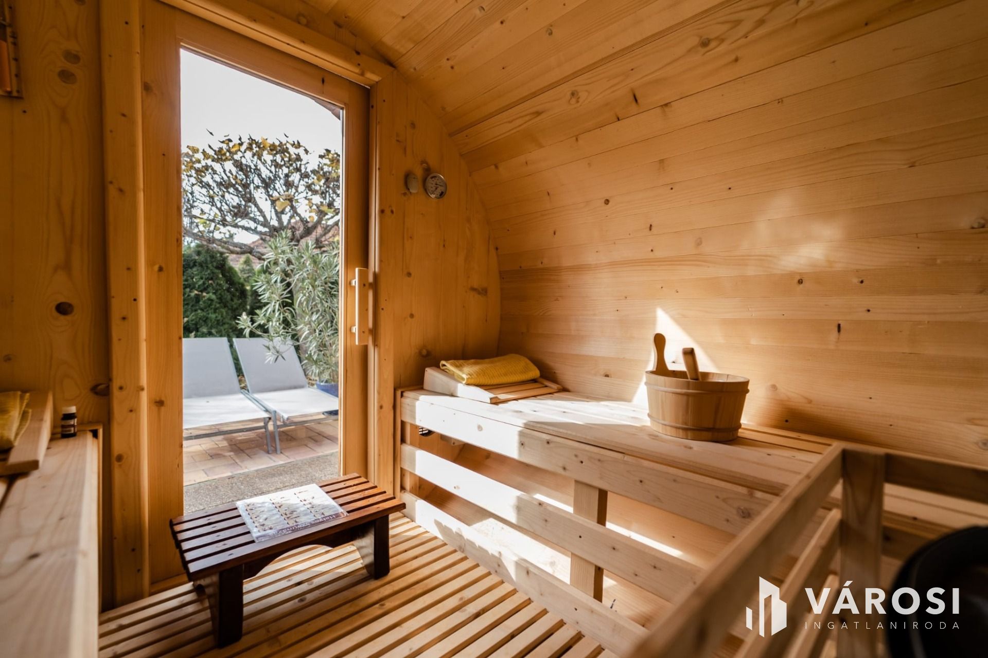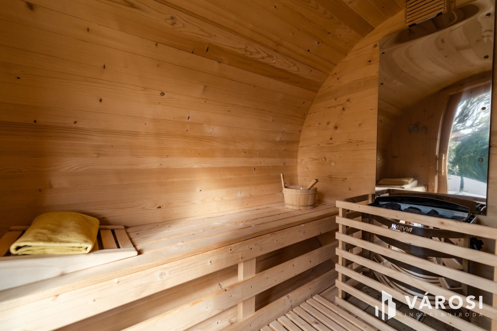 Az udvaron található egy különálló, 10 m²-es faház, amely kifejezetten az üzemeltetéshez vagy háztartási funkciókhoz szolgál tárolóként: itt kényelmesen elférnek textíliák, ágyneműk, takarítóeszközök, kerékpárok, babafelszerelések vagy szezonális bútorok. Ugyancsak az udvar része a hangulatos, 6 személyes szauna, valamint a 4 személyes jakuzzi, amely téliesítve van, így a használat időszakosan szabályozható.