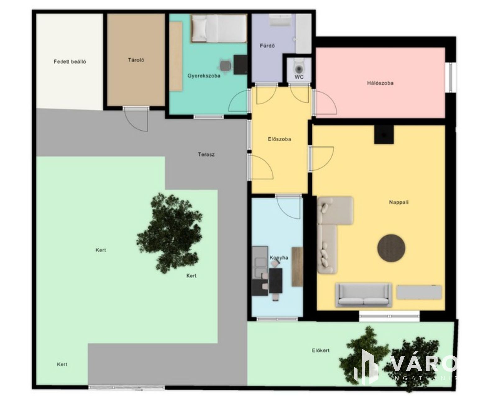 Az ingatlan kertkapcsolattal rendelkezik, így a család minden tagja élvezheti a szabadban töltött időt, akár grillezésről, akár pihenésről van szó.