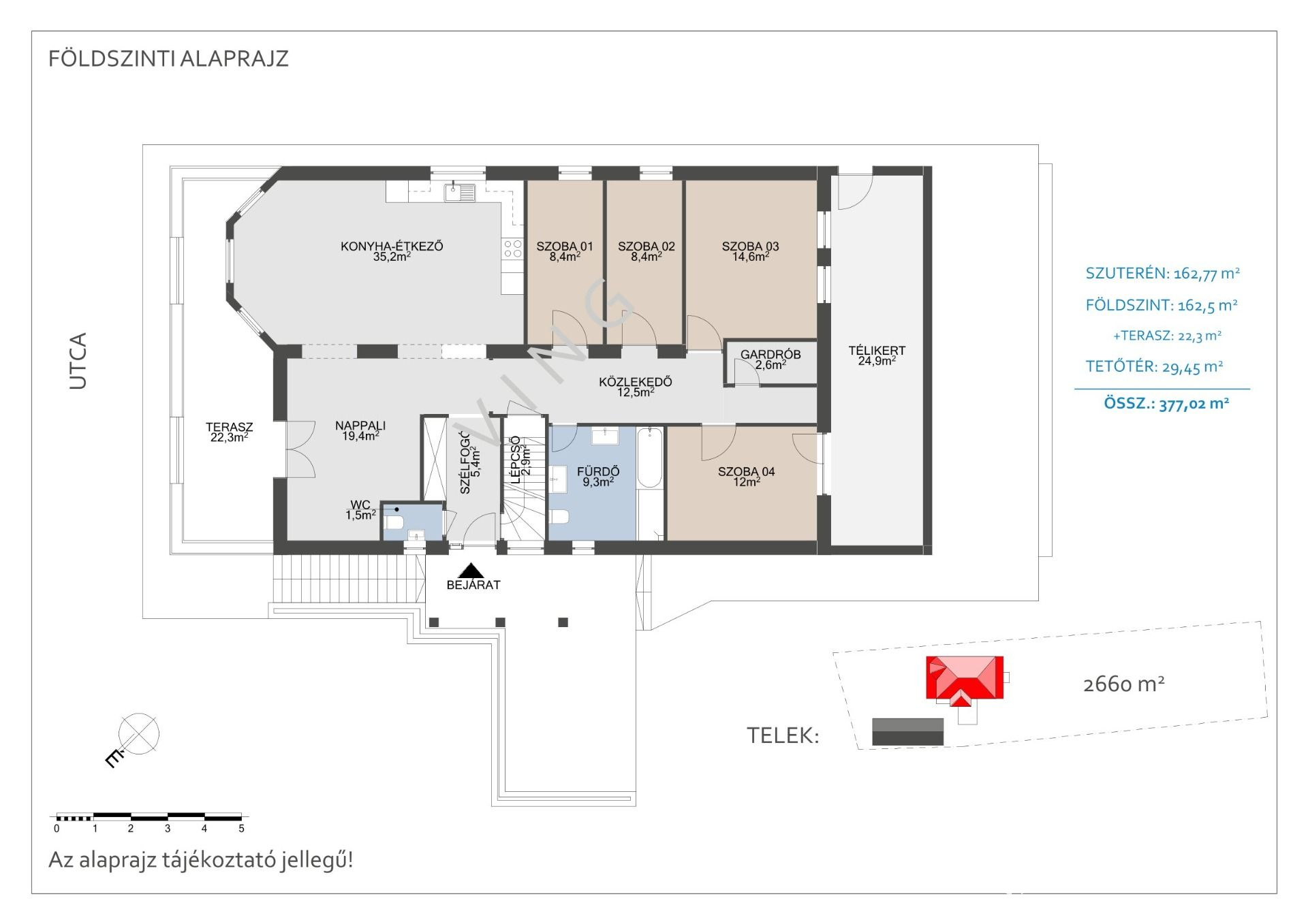 A 3 szintes 377 m2-es ház 2660 m²-es telken található.