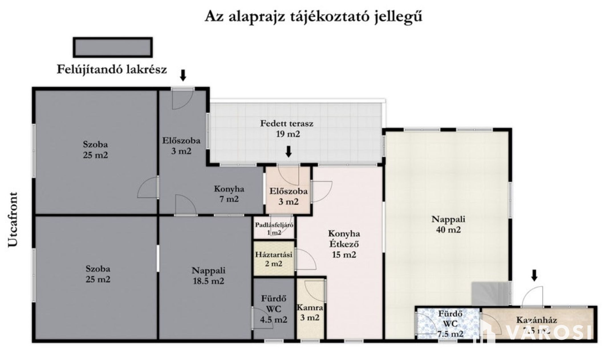 Az épület két, egymástól funkcionálisan és műszakilag is elkülönülő részből áll, amelyeket érdemes külön kezelni. Az első, utcafronti épületrész egy kisméretű téglával aláfalazott, vályog falazatú házrész, külön bejárattal és közművekkel, összesen 83 négyzetméteren. Ebben két nagy utcai szoba, nappali, fürdőszoba és konyha található. Ez a rész hosszabb ideje nem lakott, felújítást igényel, ugyanakkor adottságai miatt külön lakrésznek, irodának, vállalkozási célra vagy akár teljes bontás után új funkció kialakítására is alkalmas lehet.