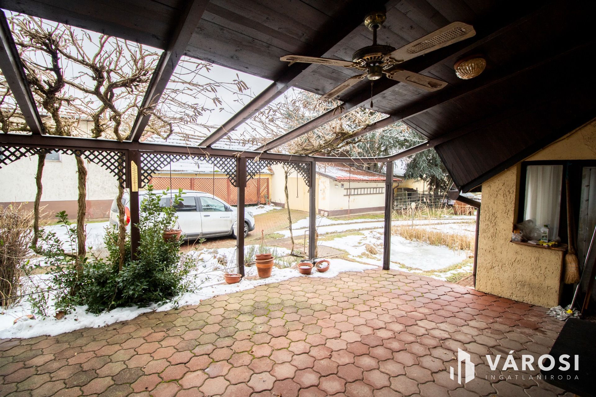 Az udvaron három garázs, egy műhely és további tárolási lehetőségek állnak rendelkezésre, a telek hátsó része pedig gondozott gyümölcsösként funkcionál, ahol szilva, alma, kajszi, szőlő és ribizli terem. A környezet rendezett, csendes, mégis minden fontos intézmény és szolgáltatás rövid távolságon belül elérhető.
