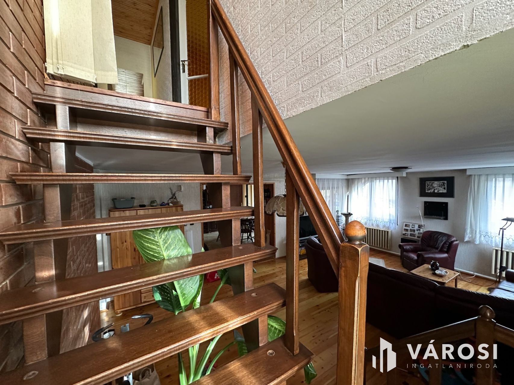 A másik, modernebb és jelenleg is használható épületrész 114 m2, teljesen más karaktert képvisel. A földszinten egy közel 40 négyzetméteres, süllyesztett kialakítású, rendkívül világos nappali kapott helyet, amely közvetlen teraszkapcsolattal rendelkezik. A 19 négyzetméteres teraszról jutunk az előszobába, innen nyílik az egy légtérben kialakított konyha–étkező, valamint a kamra és a háztartási helyiség. A földszinten található fürdőszoba és a kazánház is, az emeleten pedig három különálló szoba biztosítja a privát tereket. Ez az épületrész beton alappal és téglafalazattal épült, fa, dupla üvegezésű nyílászárókkal, és azonnal költözhető állapotú.