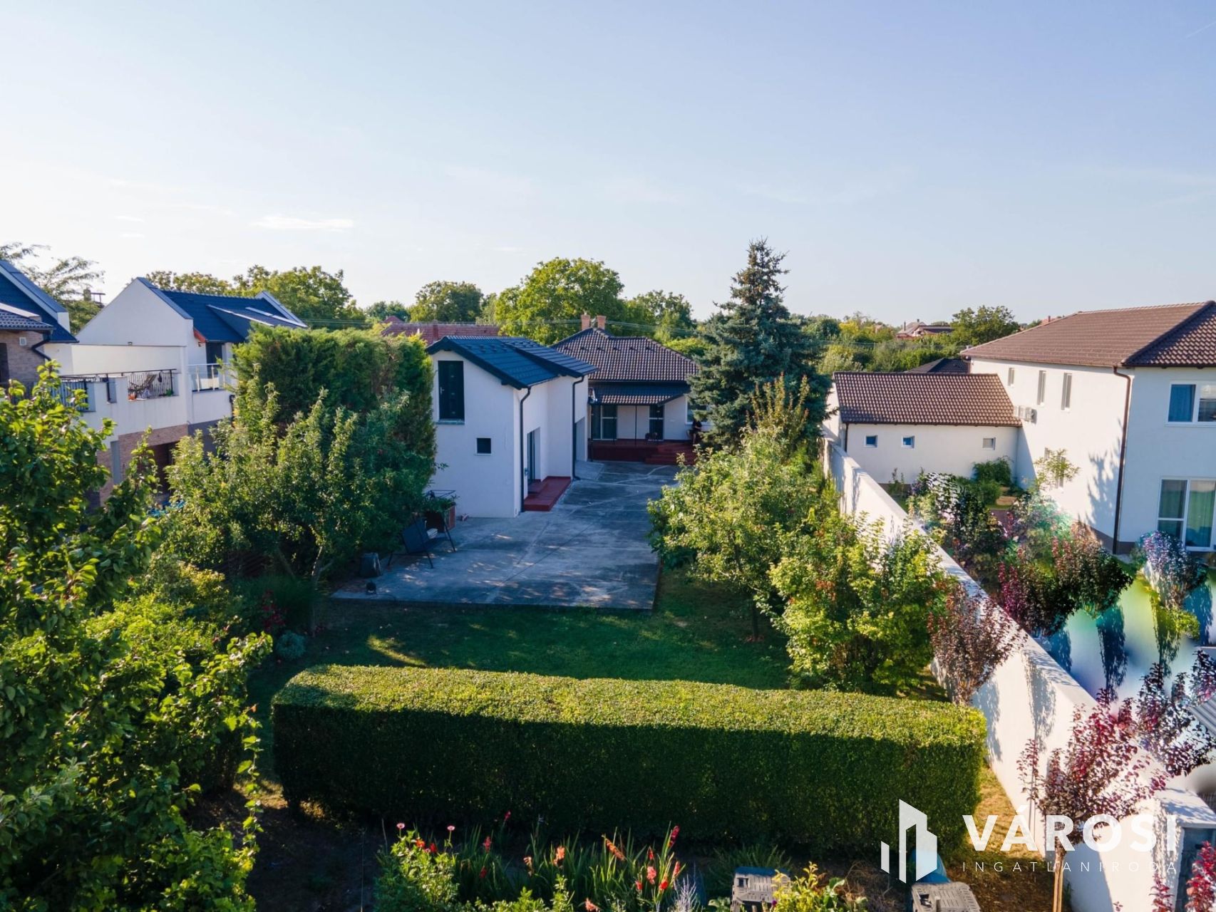 Gondosan karbantartott, parkosított kert gyümölcsfákkal és dísznövényekkel, ahol a természet közelsége és a madárcsicsergés valódi nyugalmat biztosít.